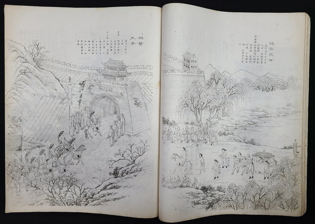 1885年 (光緒十一年) "楊忠武侯宣勤積慶圖" 畫册, 吳焯夫繪, 白紙石印本, 線裝. 此書以圖文形式描繪了清朝明將楊遇春的生平及戰績. 同時此書亦為清末最大開度的石印畫册. 刊印極佳. (28 x 34.5 cm)