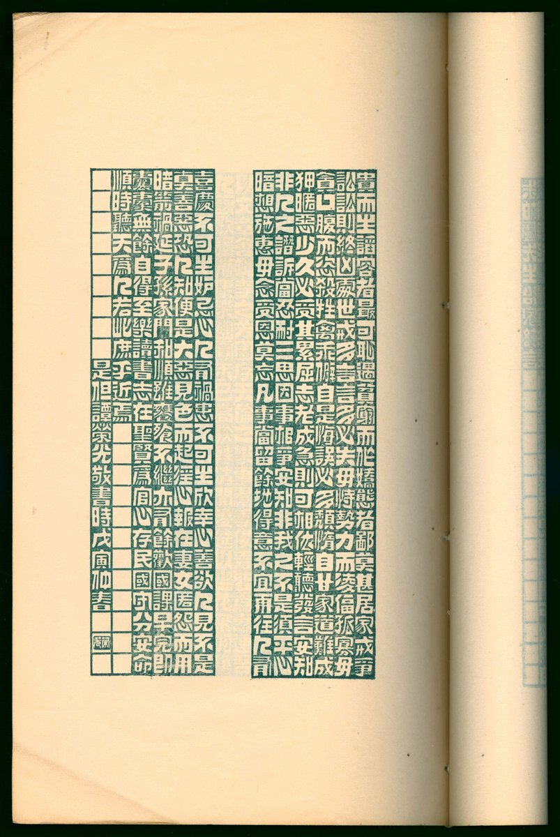 1938年(民國廿七年)9月出版"方形飛白書範"一册, 線裝, 香港印刷及發行. 東莞譚榮光著. 全書内容以墨綠色印刷, 封面簽紙頂部有缺失. (25.2 x 15 cm)