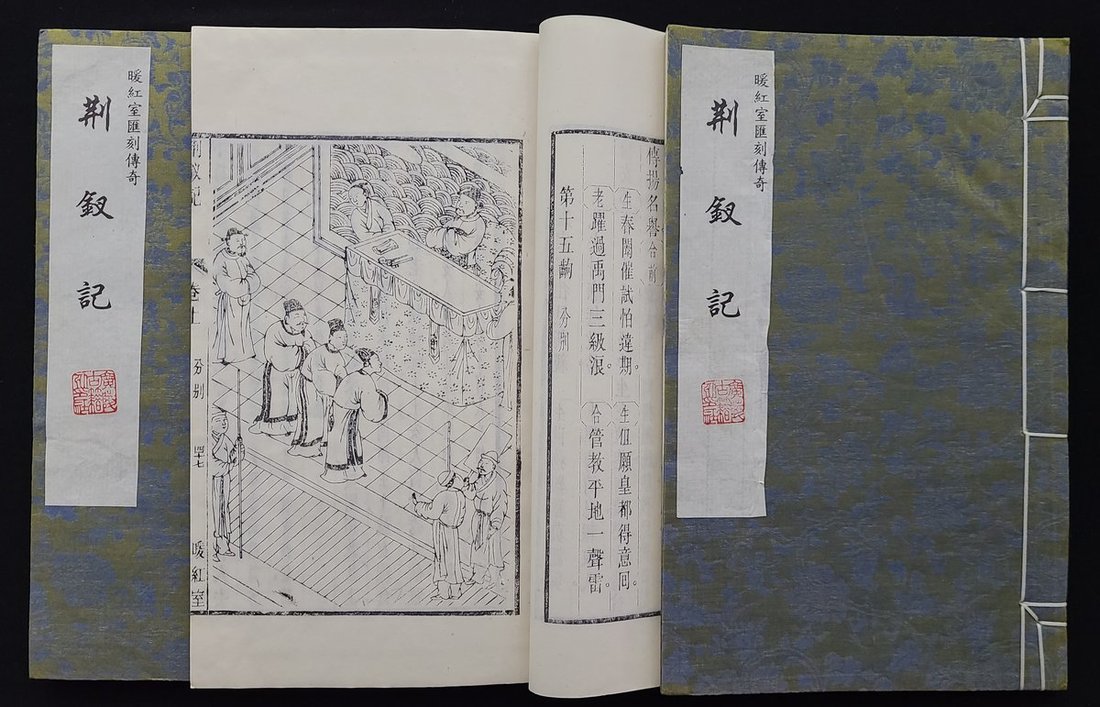 1995年5月江蘇廣陵古籍刻印社木刻重印本 "荆釵記", 據明朝萬曆本翻刻印刷. 線裝綾面三册. (17.5 x 28 cm)