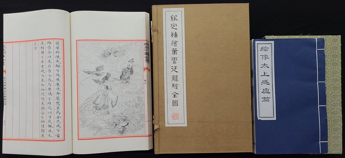 1998年2月刊 "繪像太上感應篇" 線裝一册, 有書函, 中國書店岀版 (16.5 x 26 cm); 及2002年12月刊 "欽定補繪蕭雲從離騷全圖" 包背裝一函三册, 上海古籍出版社出版. (20 x 31.8 cm)