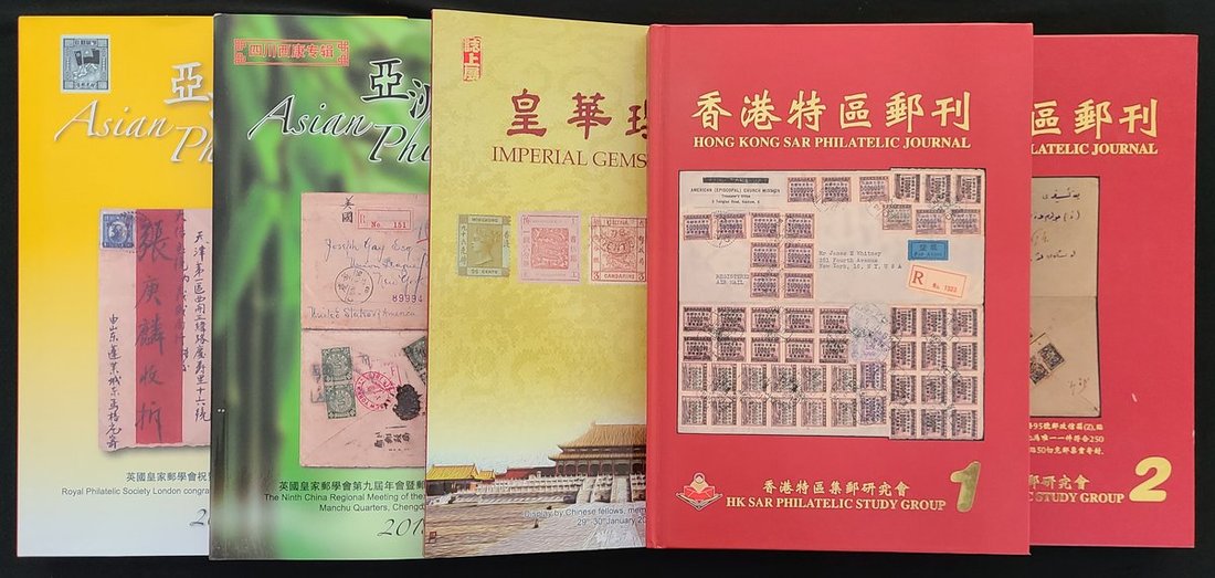 1999-2018 Hong Kong SAR Philatelic Journal No. 1, 2 hardback deluxe edition numbered Chinese and English articles. Asian philatelist 2015 (hardback edition), 2018 and Imperial Gems of China published in 2015 to celebrate the display at Royal Philatelic Society, London by members. Total 5 books as new.