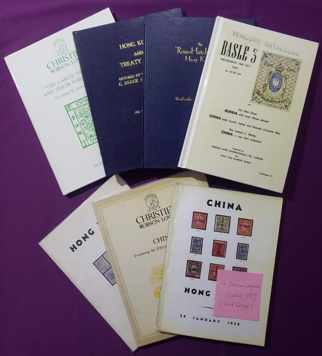 A group (2 copies and 5 original ) which includes five Robson Lowe Ltd., London. 1949 The "Rose Hutchinson" collection of Hong Kong; 1955 "Hong Kong and Treaty Ports" offered by the order of C. Derek Houston, Esq.; 1959 "China, Hong Kong and Treaty Ports" (copy); 1961 Hong Kong and Treaty Ports; 1974 "Russia with Post Offices Abroad/ China with French, Italian and Russian Consular mail/ the Joseph C. Wong China - the mint collection" (copy in hardcover); Two Christie's catalogues: 1988 "China/ Featuring the Ellery Denison Collection", and 1989 "The Large Dragons and Their Forerunners/ The Philip W. Ireland Collection".