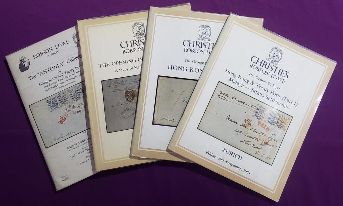 A group of Christie's sales which includes 1981 "The 'Antonia' Collection of Hong Kong and Treaty Ports" in Tokyo; 1984 "Hong Kong & Treaty Ports (Part I) Malaya - Straits settlements"; 1985 Hong Kong (Part II); 1987 "The Opening of China 1701-1885". (4)