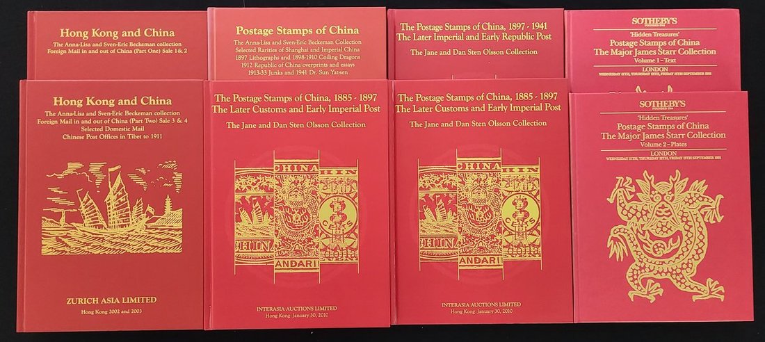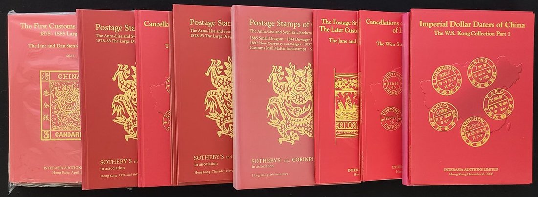 1991-2018 a lot of 19 copies of China Philatelic auction catalog from Sotheby's, Interasia or Zurich Asia; including Sotheby's 1991 "Postage Stamps of China / The Major James Starr Collection Volume 1-2"; 1996-1999 "Postage Stamps of China / The Anna-Lisa and Sven-Eric Beckeman Collection" (9 copies) by Sotheby's; 2002&2003 "Hong Kong and China / The Anna-Lisa and Sven-Eric Beckeman Collection" by Zurich Asia; 2007 "Postage Stamps of China / The Anna-Lisa and Sven-Eric Beckeman Collection" by Zurich Asia; 2008-09 "Imperial Dollar Daters of China / The W.s. Kong Collection Part 1 & 2" and heardcover copy, by Interasia; 2010 "The Postage Stamps of China, 1885-1897, 1897-1941 / The Later Imperial and Early Republic Post / The Jane and Dan Sten Olsson Collection" by Interasia; 2012&2013 "Cancellations of the First Customs Issue of Imperial China", by Interasia; 2012-14 "Cancellations of the First Customs Issue of Imperial China / The Wen Sun Kong Collection Part 1-3", and "The Postage Stamps of China 1885-1897 The Later Customs and Early Imperial Post / The Jane and Dan Sten Olsson Collection", by Interasia; 2017-08 "The First Customs Issue of China 1878-1885 Large Dragons / The Jane and Dan Sten Olsson Collection" Sale 1-3 and a hardcover, by Interasia. All in good condition.