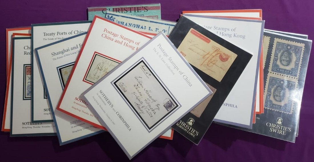 A group with Sotheby: 1994-96 "Postage Stamps of the Far East" (3), 1996 " China Red Revenue Covers" and " Treaty Ports of China" (2); Sotheby's and Corinphila: 1997-99 Postage Stamps of China and Hong Kong (6), 1997 "Shanghai and Formosa/ The Estate of Wei Liang Chow" and 1997 "Postage Stamps of China/ The E. N. Lane Collection". Also 1990-96 eight catalogues from Christie's, included six of "Fine Stamps and Covers of Hong Kong and China", 1994 "The James B. Whang Collection of The Large Dragons of China 1878-85"(1) and 1990 "Hong Kong and Treaty Ports/ The Christopher D'Almada Collection"