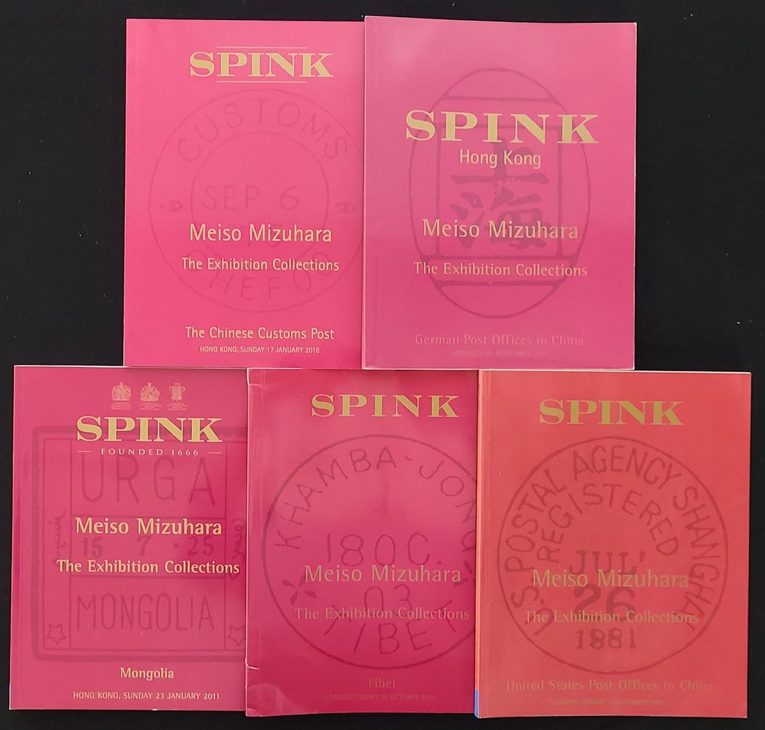 2001-2016 five copies of auction catalog of Meiso Mizuhara by Spink. Included: 2001 (Hong Kong 24 Nov.) German Post Offices in China; 2002 (London 18 Oct.) Tibet; 2003 (London 5 Dec.) United States Post Offices In China; 2011 (Hong Kong 23 Jan.) Mongolia; 2016 (Hong Kong 17 Jan.) The Chinese Customs Post.
