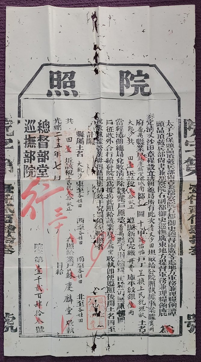 1899年總督部堂巡撫部院頒佈院照1件,內容涉及大靴沙繳納田稅之內容,蓋總督部堂巡撫部院官方,保存完整
