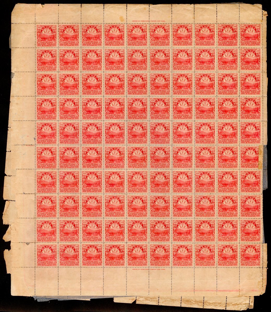 1908年紐約版大清印花稅票1000文100枚全張4版,均貼於背紙上,整體邊紙完整,總體上中品,較少見