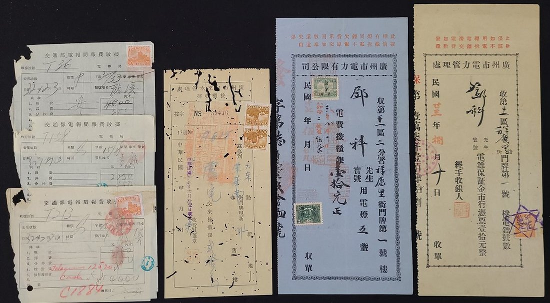 1928-43 A group of seven old Guangzhou receipts, including electricity, water and telegram fees, most of which are affixed with tax stamps.