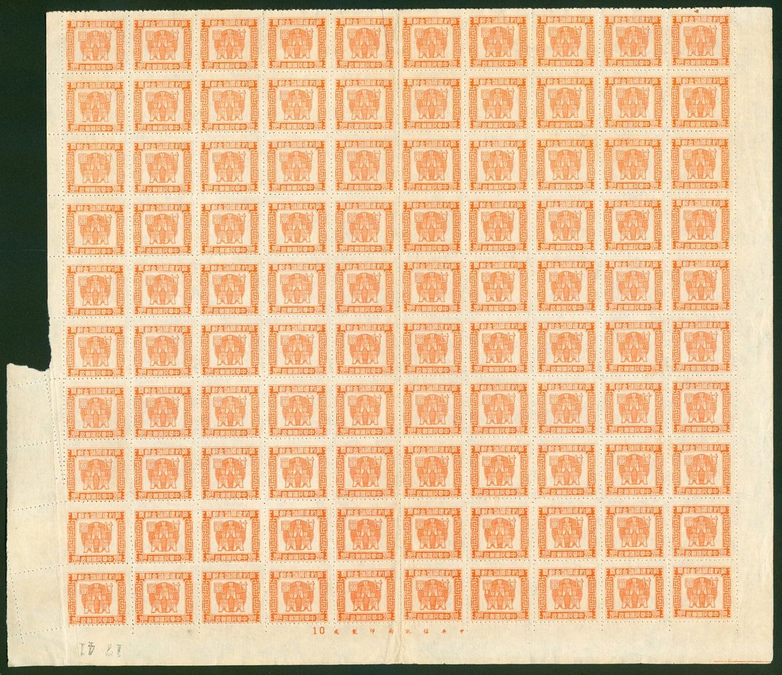 1943年中信版古幣圖節約建國儲金郵票20元新票100枚全張1版,上邊,左邊部分邊紙缺失,其餘邊紙均完整,保存完好