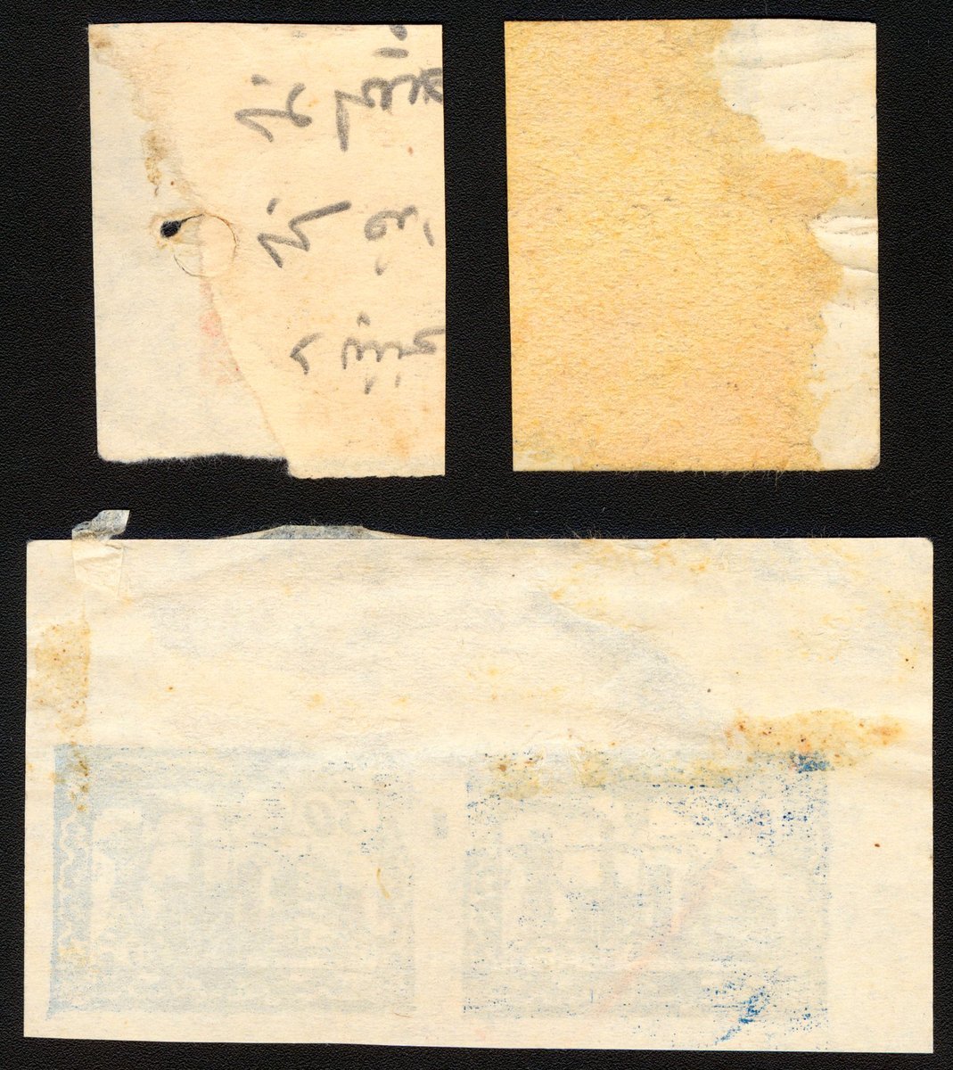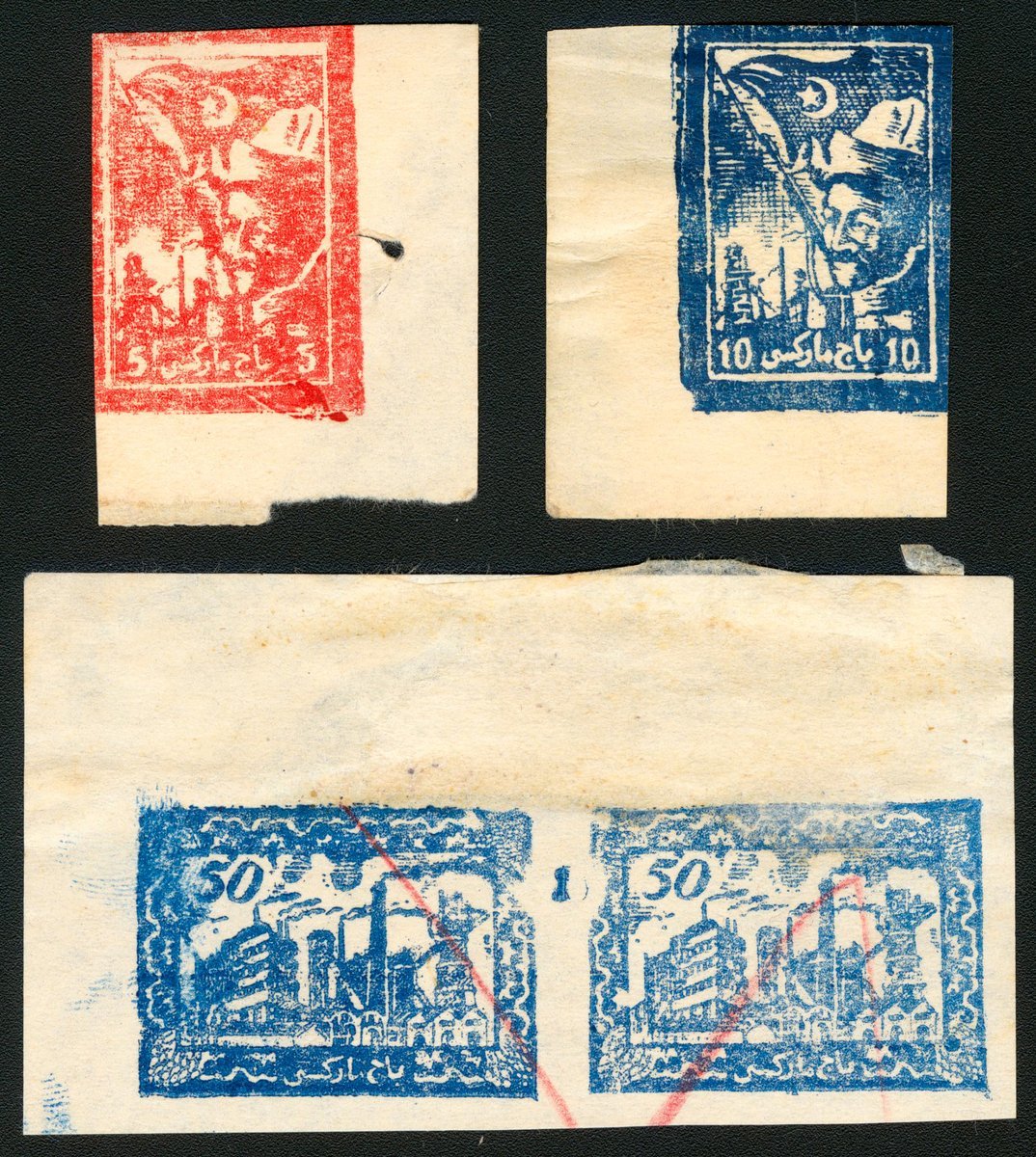 1945年新疆三區地方印花稅票舊票4枚,包括5元10元各一枚,50元橫雙連,均帶邊紙,上中品