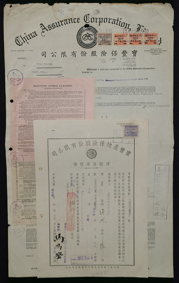 1949年寶豐公司 (China Assurance Corporation) 保險單两份, 分別貼上中華民國印花税票, 及加蓋限上海市用人民幣拾圓及伍拾圓印花税票