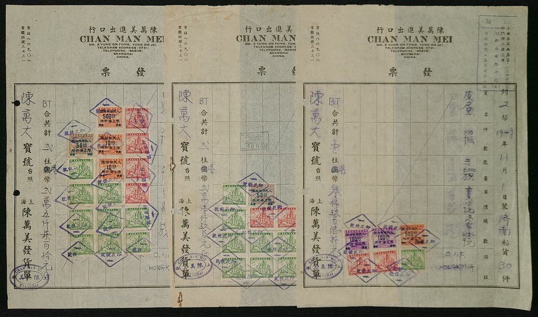 1949 (1 Nov.) Three copies of Shanghai export goods invoices, all of which are affixed with Shanghai tax stamps or R.O.C. tax stamps overprinted  "Use for Shanghai only" in Renminbi value.