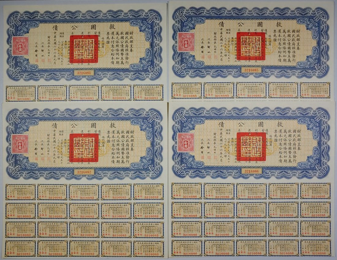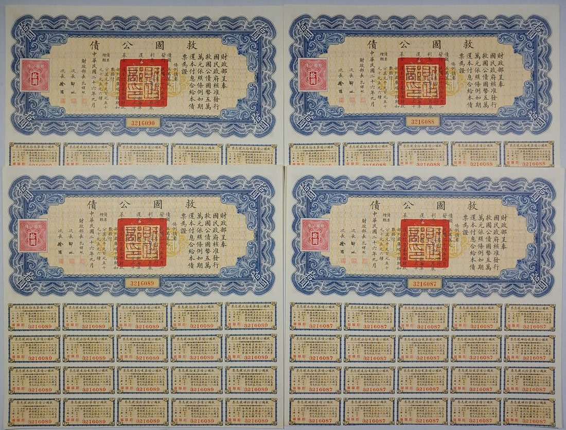民國二十六年救國公債10元一組8枚,編號3216081-82, 85-90,UNC
