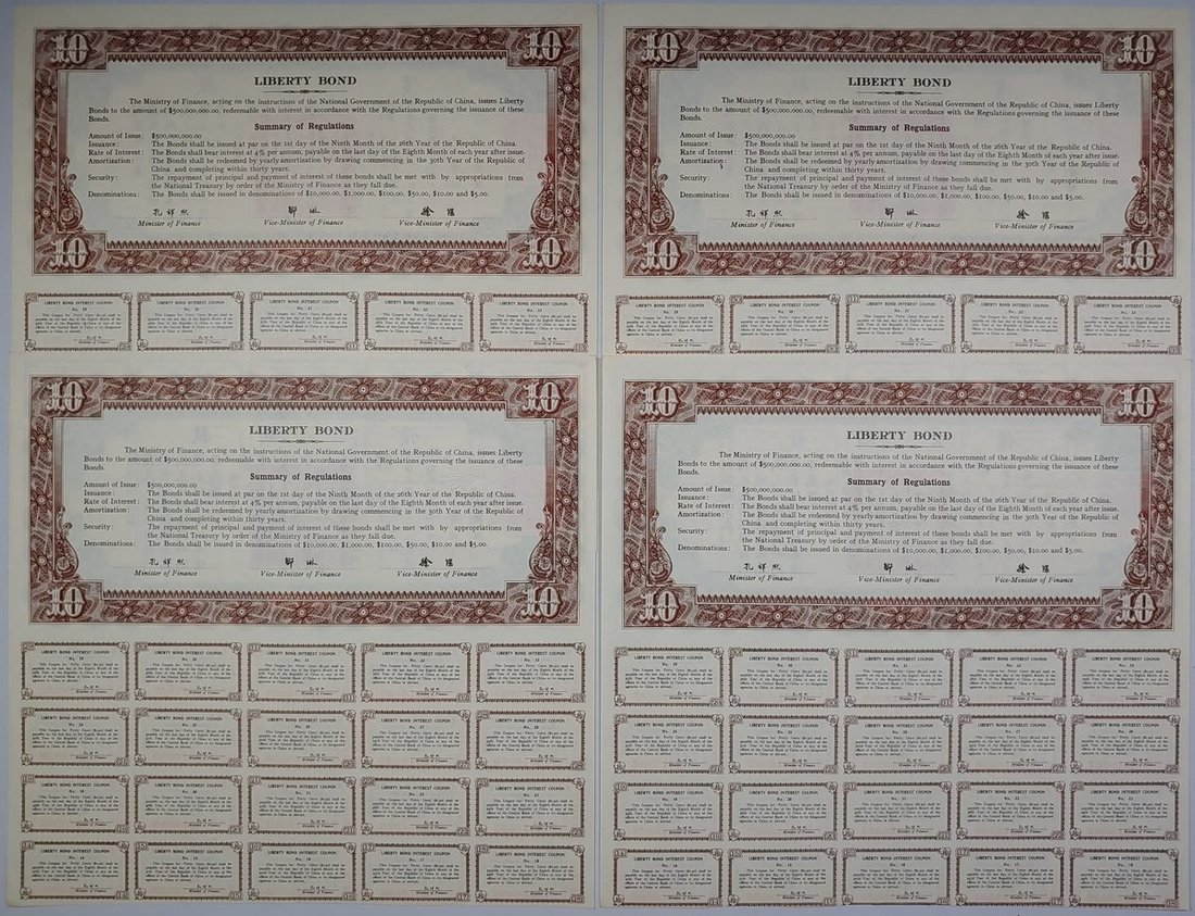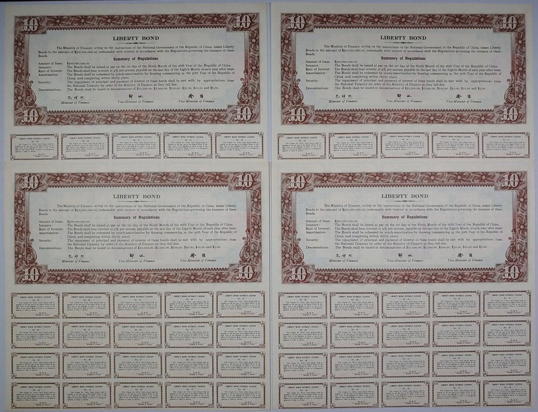 Republic of China, 8x Liberty Bond for 10 Yuan, numbers 3216081-82, 85-90, 1937, uncirculated (8)