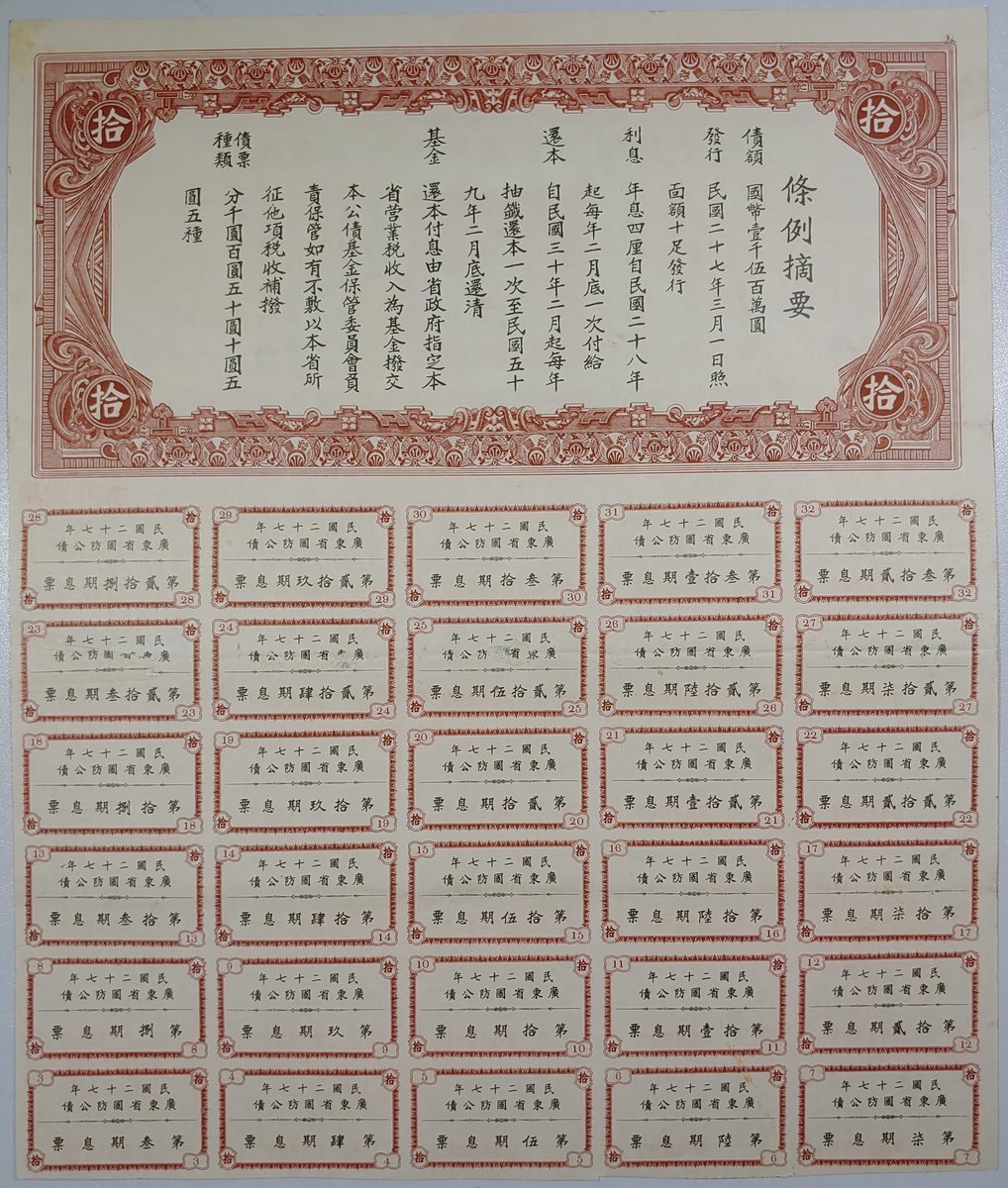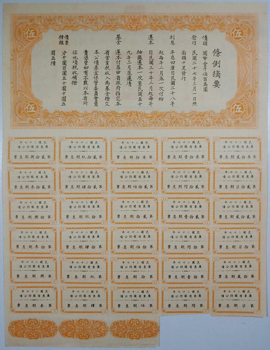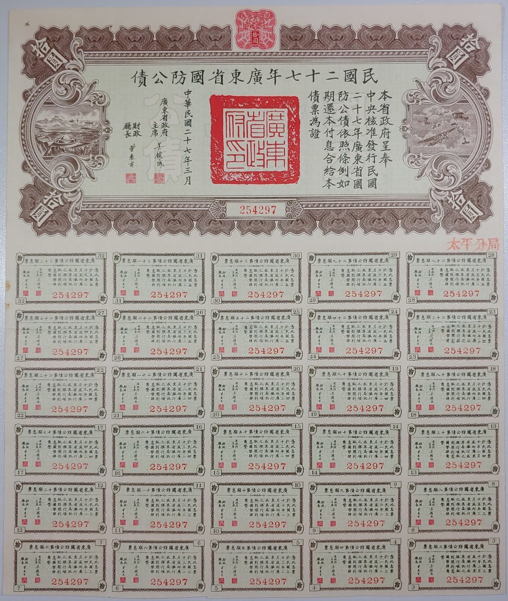 Republic of China, a pair of Kwangtung Province 4% Defense Loan, 5 Yuan and 10 Yuan, 1938, numbers 734998 and 254297, extremely fine to about uncirculated, with coupons attached (2)