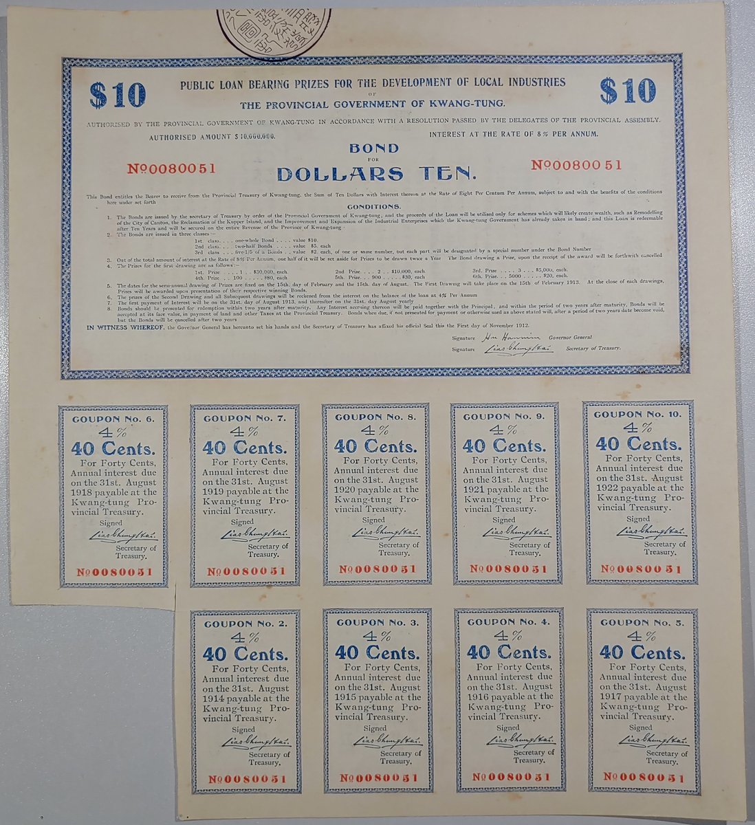 Republic of China, Kwangtung Provicne Public Loan with Prizes for Developmetn of Local Industries, $10 bond, number 0080051, also Hong Kong, Tak Wan Restaurant, an unused shares certificate, 1950,