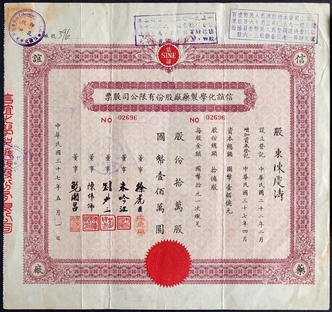 Sin Yi Chemical Pharmaceuticals Co. Ltd., 100,000 shares worth 1,000,000 Yuan, 1948, about extremely fine