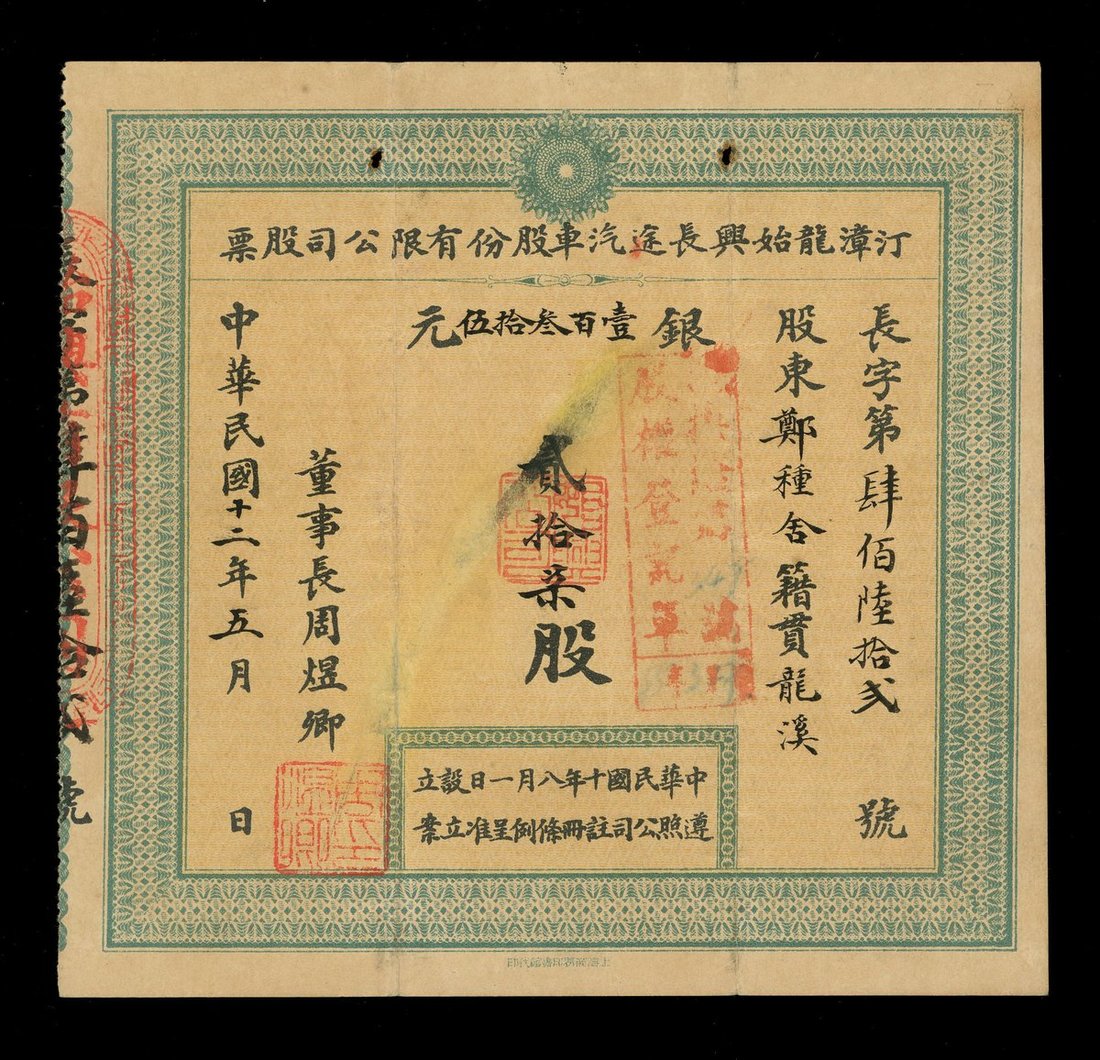 民國十二年汀漳龍始興長途汽車股份有限公司27股,面值135元,編號462,EF