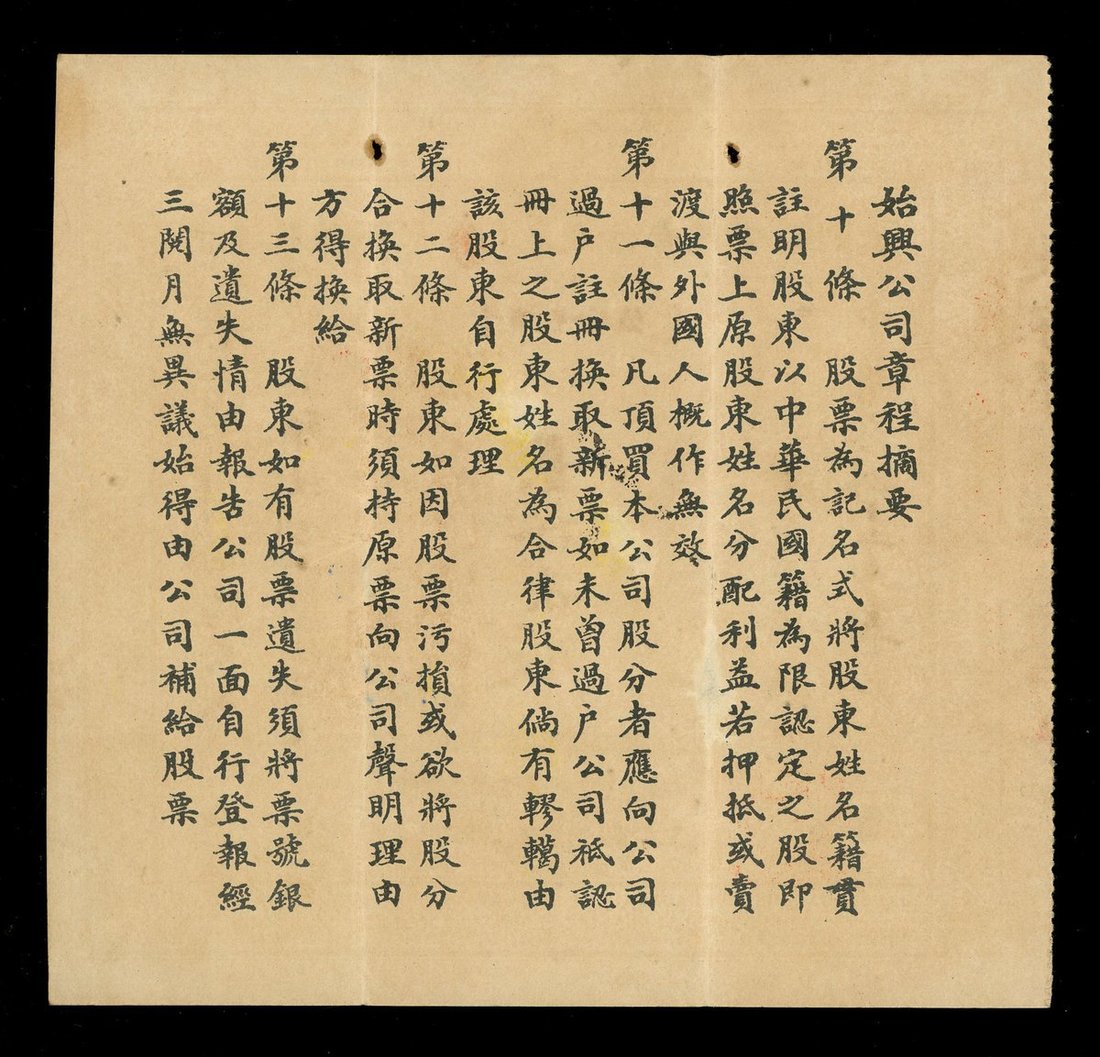 Ding Zhang Long Shi Xing Coach Company, certificate for 27 shares, worth 135 Yuan, 1923, serial number 462, extremely fine