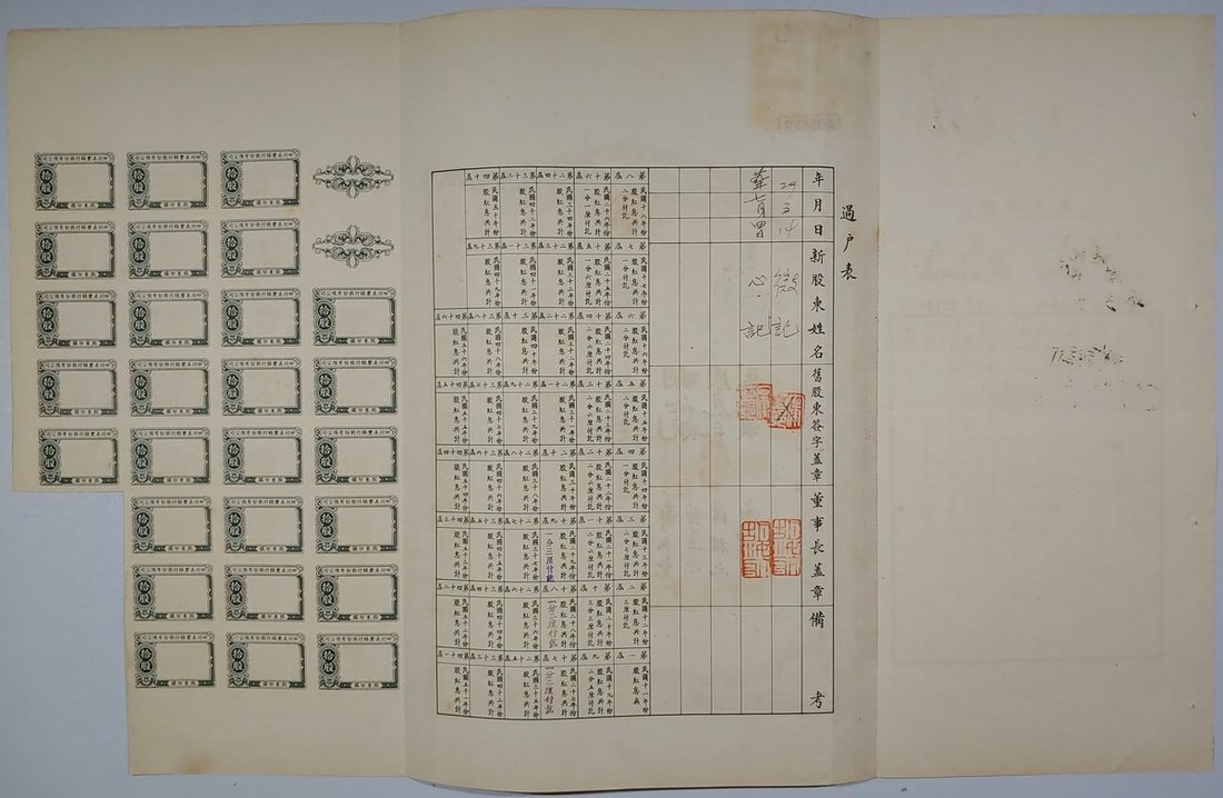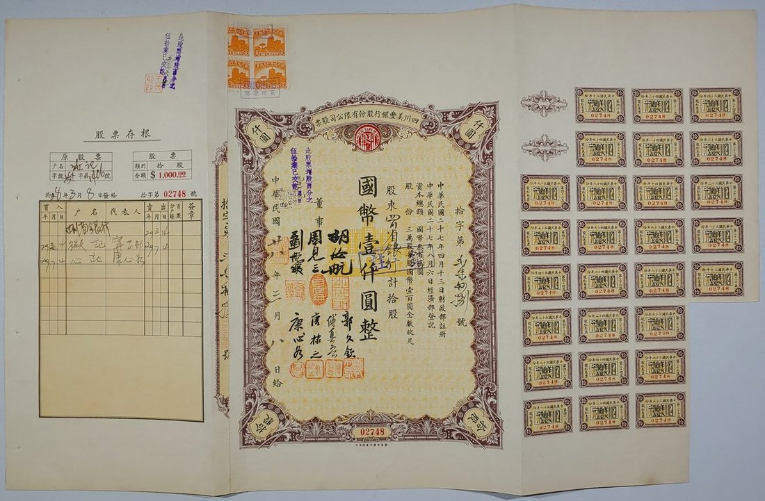 Szechuan Mei Feng Bank, certificate for 10 shares worth 1000 Yuan, 1939, number 02748, about uncirculated, with coupons, counterfoil re-attached