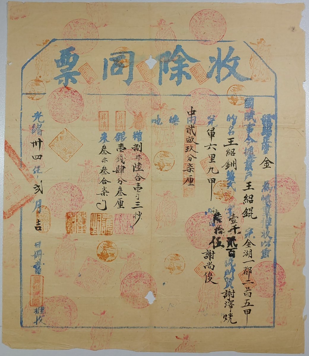 Qing Dynasty, a local payment/purchase receipt, Guangxu Year 34 (1908), about fine, multiple repeated stamp marks at obverse