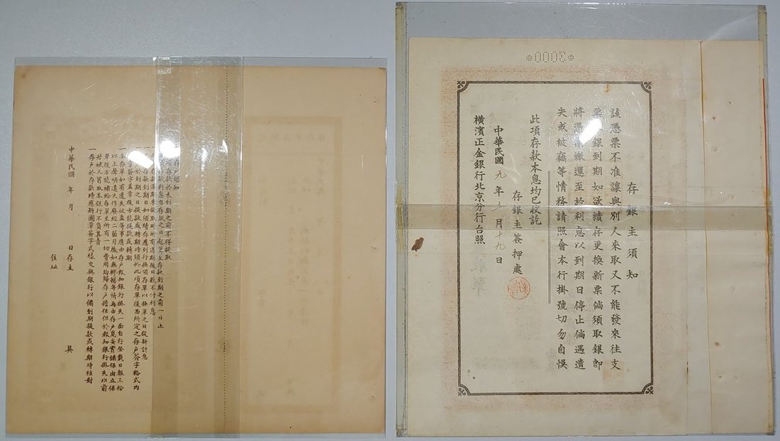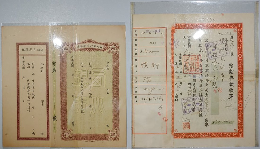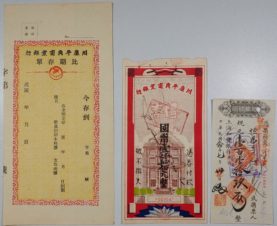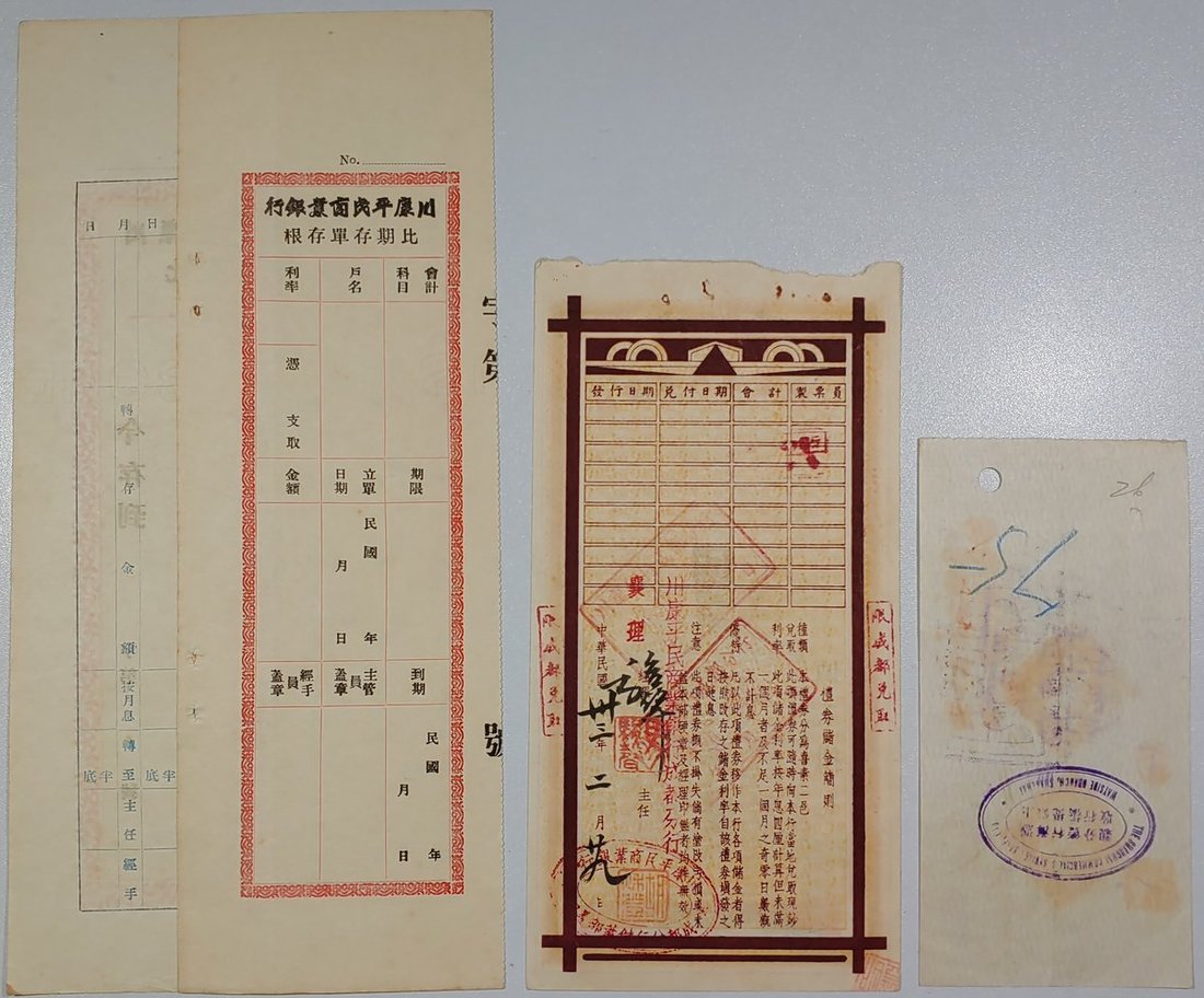 Republic of China, group of 5, consisting of: Chuan Kang People's Commercial Bank, 1400 cash coupon, 1944 and an unused bank receipt, Northwest Bank, an unused time deposit receipt, Yokohama Specie Bank, time deposit receipt for 3000 Yuan, Taisho Year 9 (1920), also The Shanghai Commercial and Savings Bank, Wayside Branch, cashier's cheque for 119 Yuan, 1931,