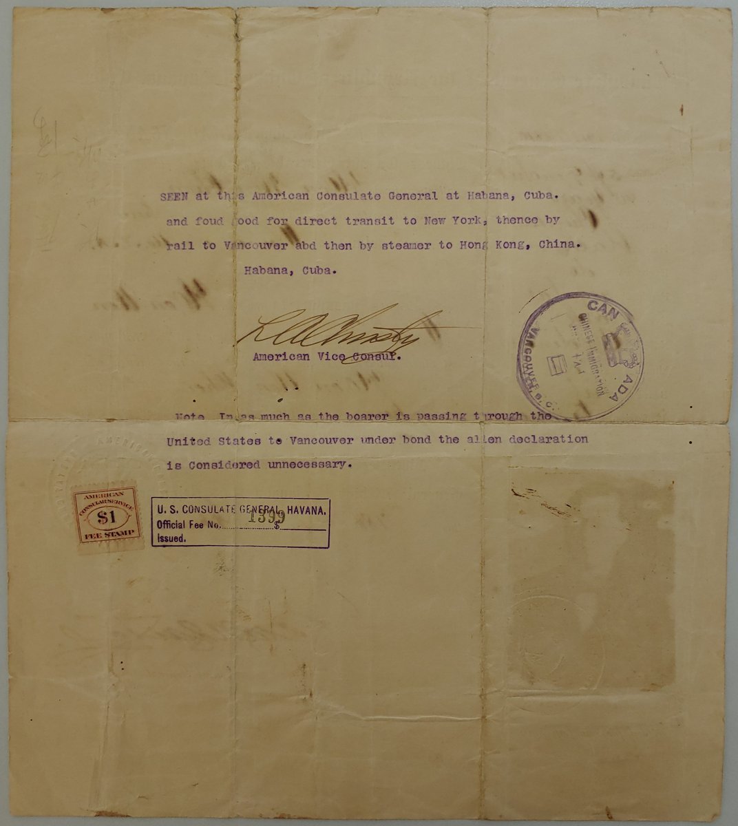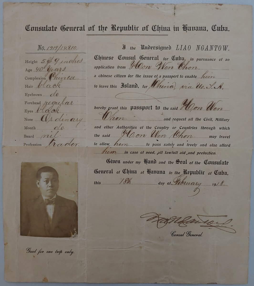 Consulate General of the Republic of Chiba in Havana, Cuba, passport for a gentleman named Hon Wen Chon, dated 18.2.1918, well preserved