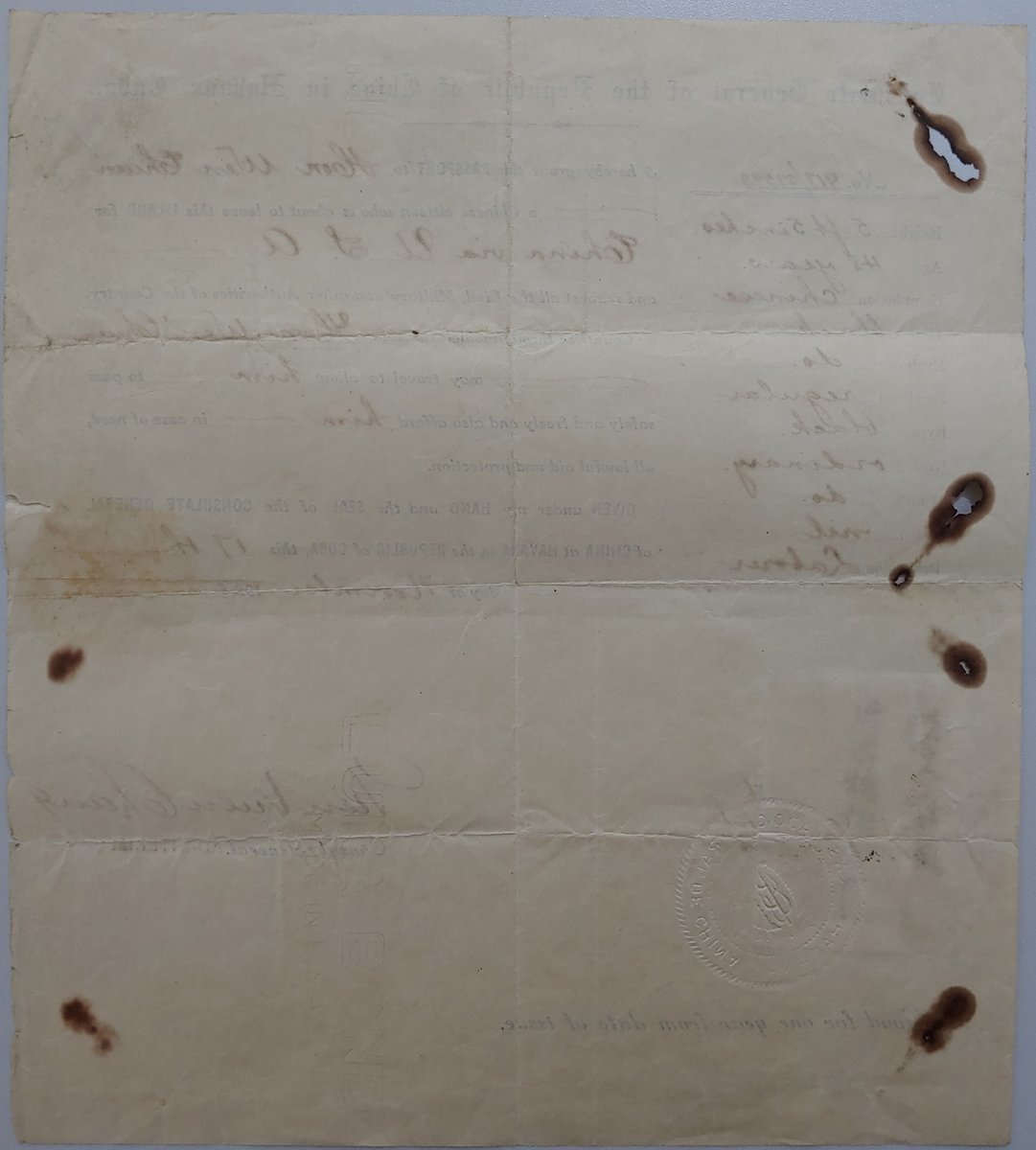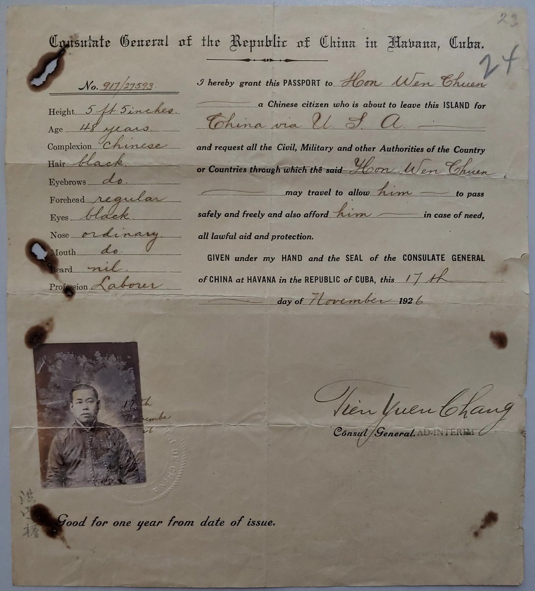 Consulate General of the Republic of Chiba in Havana, Cuba, passport for a gentleman named Hon Wen Chuen, dated 17.11.1926, well preserved