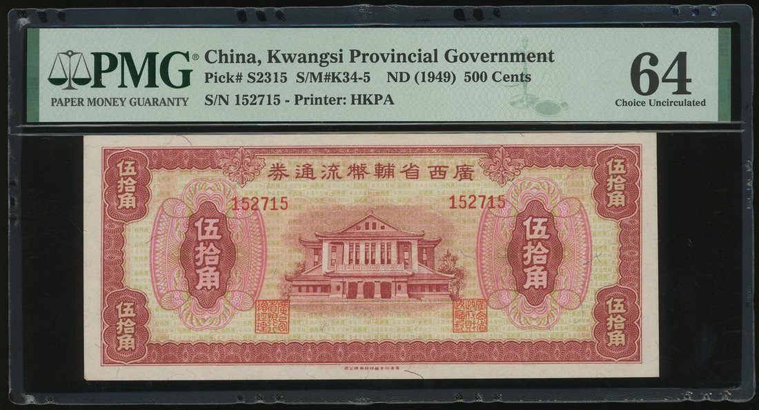 Kwangsi Provincial Government, 500 cents, 1949, serial number 152715, (Pick S2315), PMG 64 Choice Uncirculated
