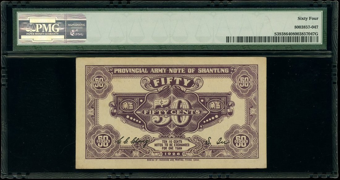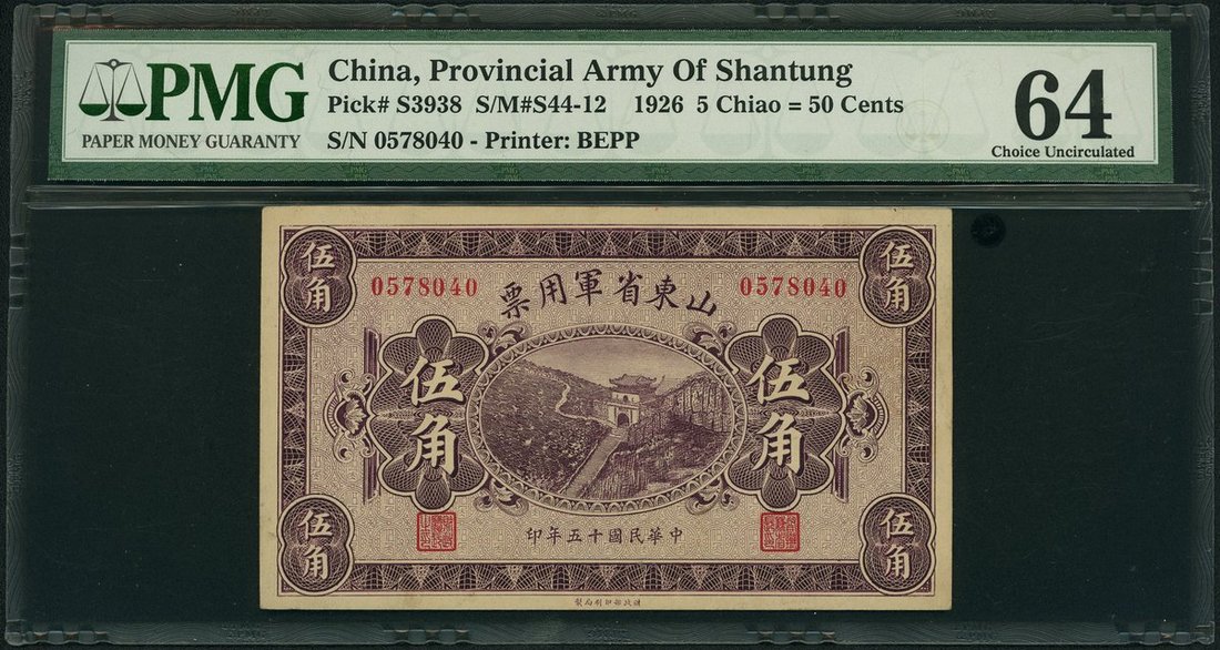 Provincial Army Note of Shantung, 50 cents, 1926, serial number 0578040, (Pick S3938), PMG 64 Choice Uncirculated