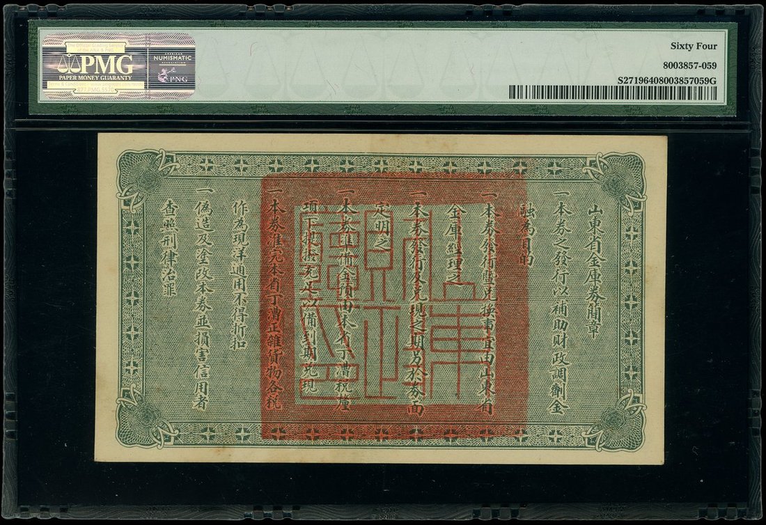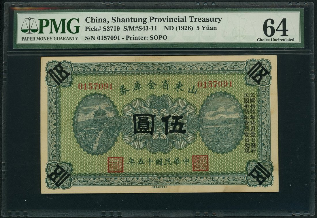 Shantung Provincial Treasury, 5 Yuan, ND (1926), serial number 0157091, (Pick S2719), graded PMG 64 Choice Uncirculated