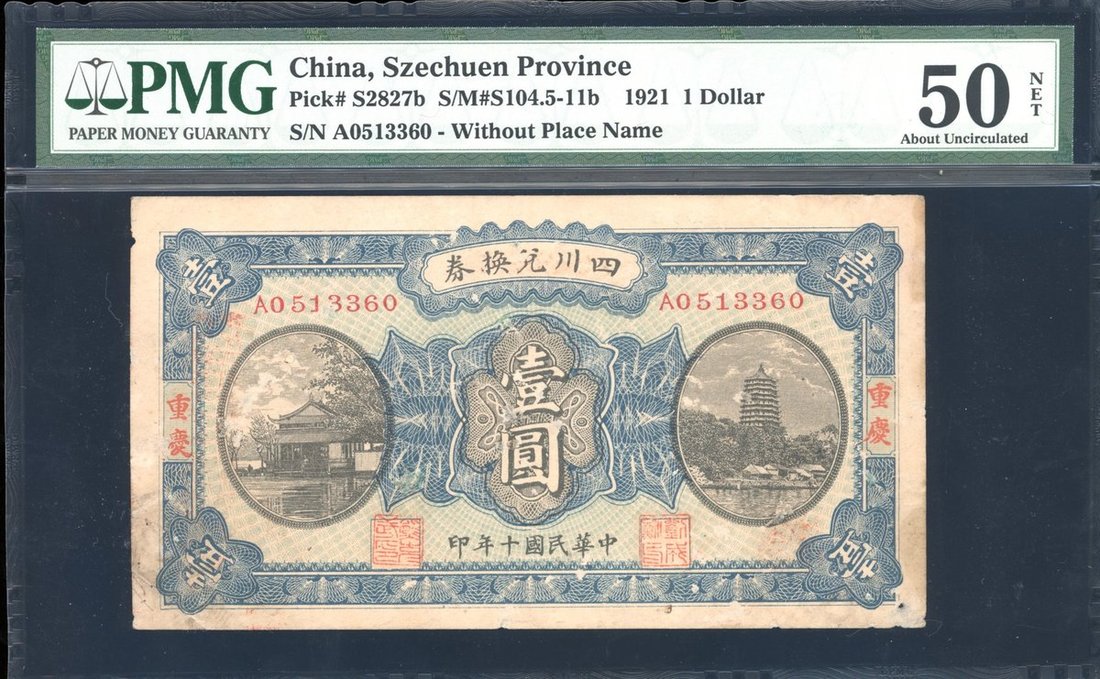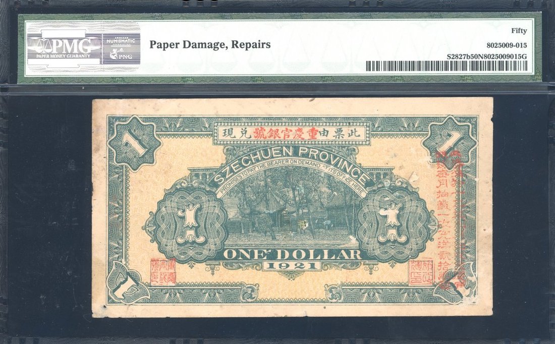 Szechuan Province, $1, Chungking, 1921, serial number A0513360, (Pick S2827b), PMG 50NET About Uncirculated (Paper Damage, Repairs)