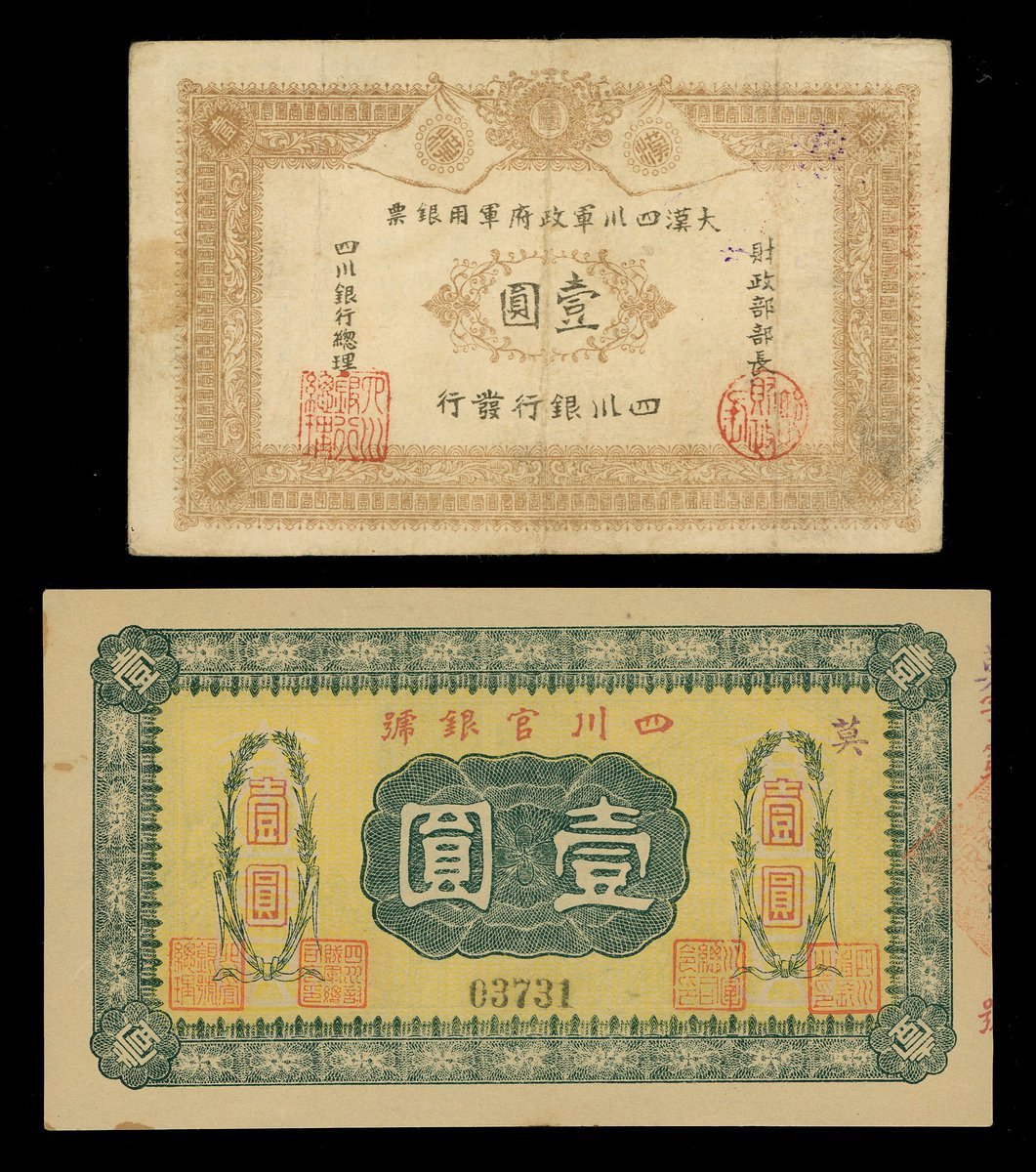 Szechuan Province, Szechuan Official Bank, 1 Yuan, ND, 03731, also Ta Han Szechuan Military Government, 1 Yuan, ND (1912), serial number 8883, (Pick S2809, S3948), the former about uncirculated with stains, the latter very fine (2)