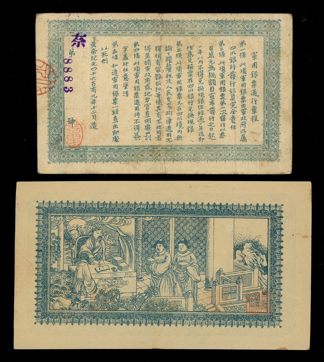 四川官銀號票1元,無日期,編號03731,及1912年四川大漢軍政府軍用銀票1元,編號8883,前者AU有漬,後者VF