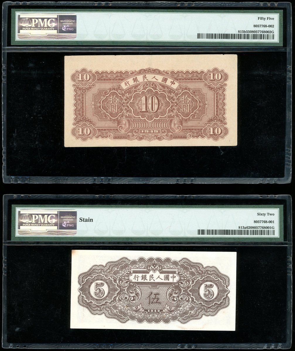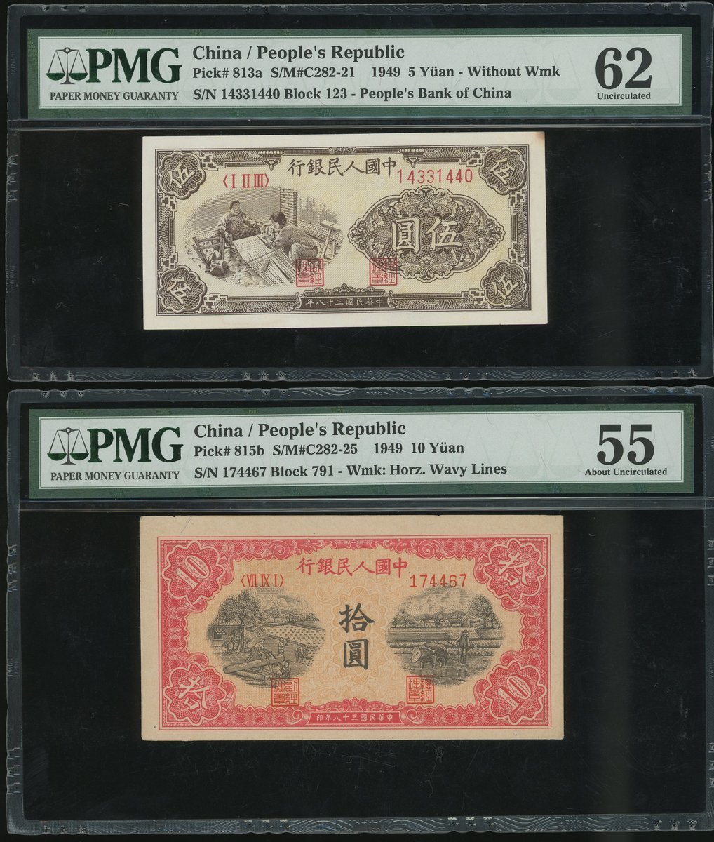 1948-1949年中國人民銀行第一版人民幣5元「紡織」厚版及10元「鋸木與耕地」大編號版,編號 14331440及 174467,分別評PMG 62及55