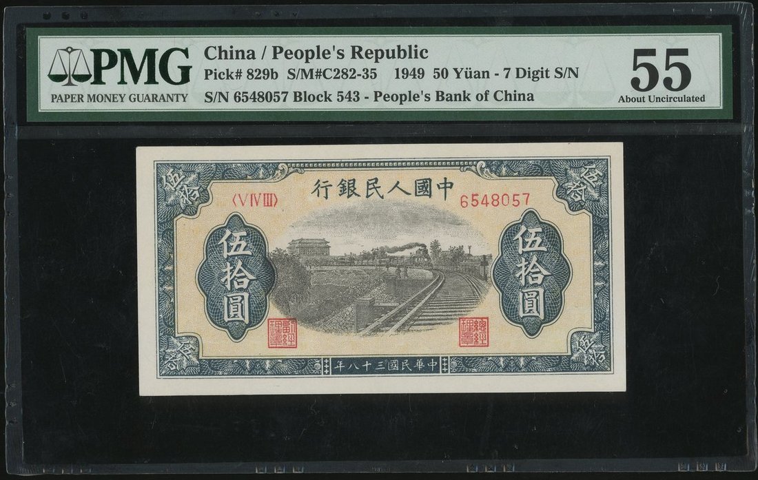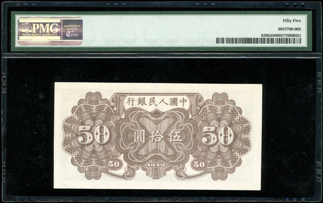1948-1949年一版人民幣50元「火車」,編號V IV III 6548057,長頸5版,PMG 55