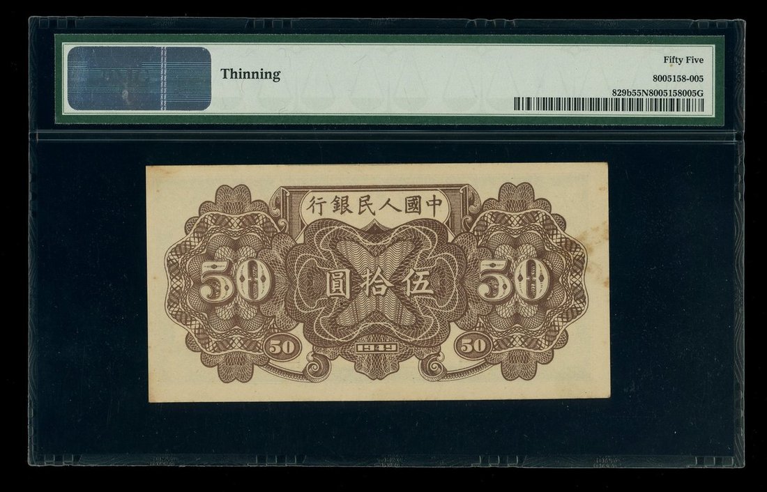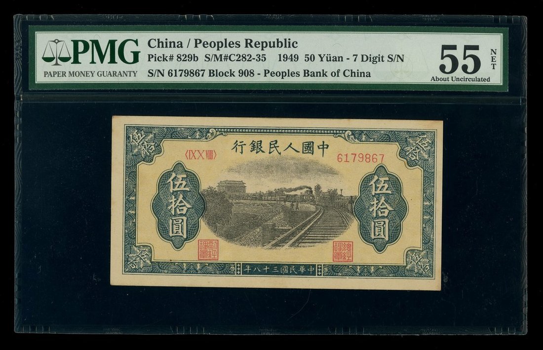 1949年中國人民銀行第一版人民幣50元「火車」,編號IX X VIII 6179867,PMG 55NET,有揭薄
