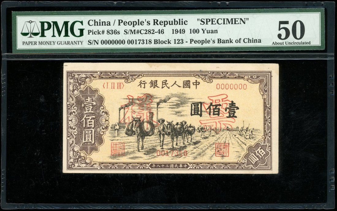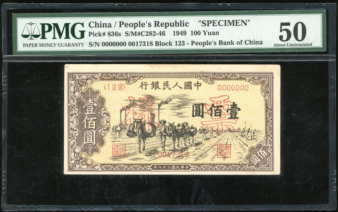 1949年中國人民銀行第一版人民幣100元「驢運」樣票,控號0017318,PMG 50