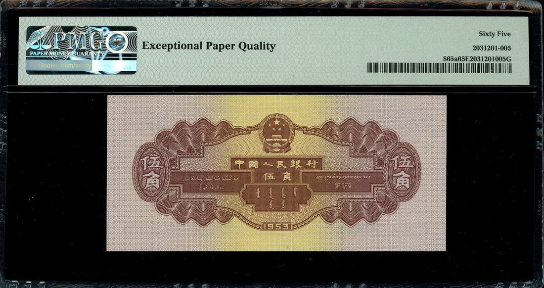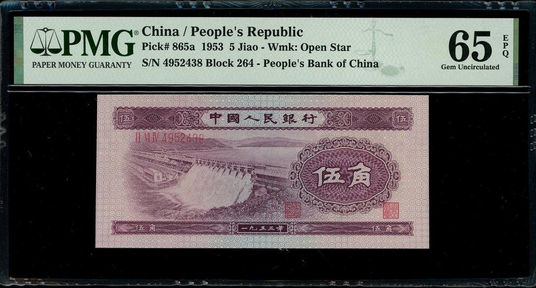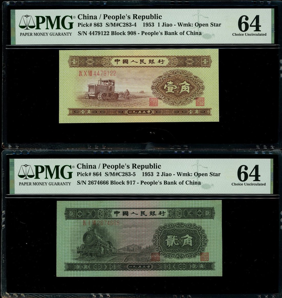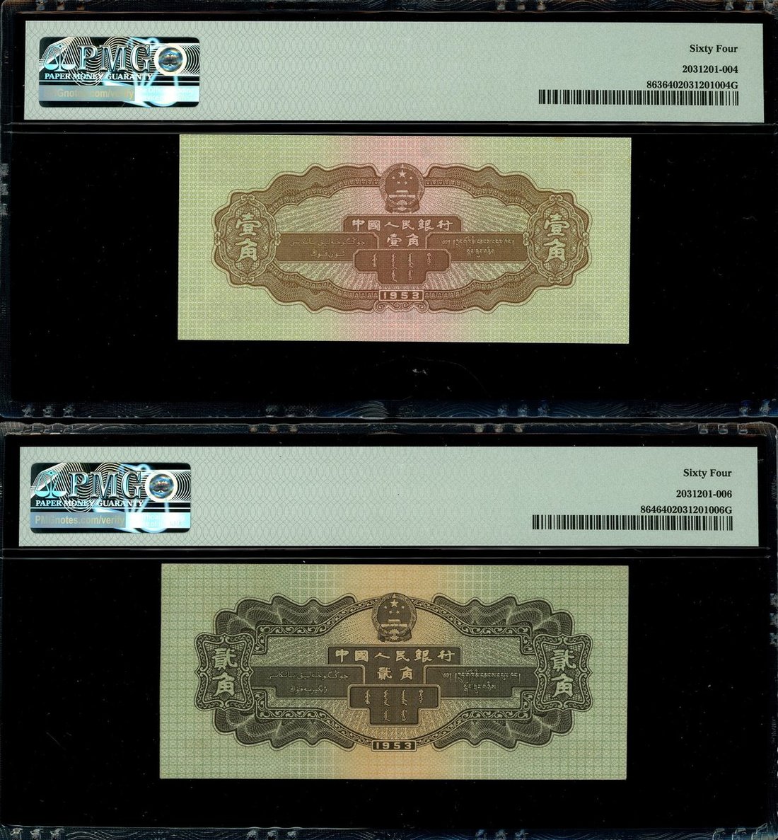 1953年中國人民銀行第二版人民幣1,2及5角,編號IX X VIII 4479122, IX I VII 2675666, II ViIV 4952438,分別PMG 64, 64 及 65EPQ