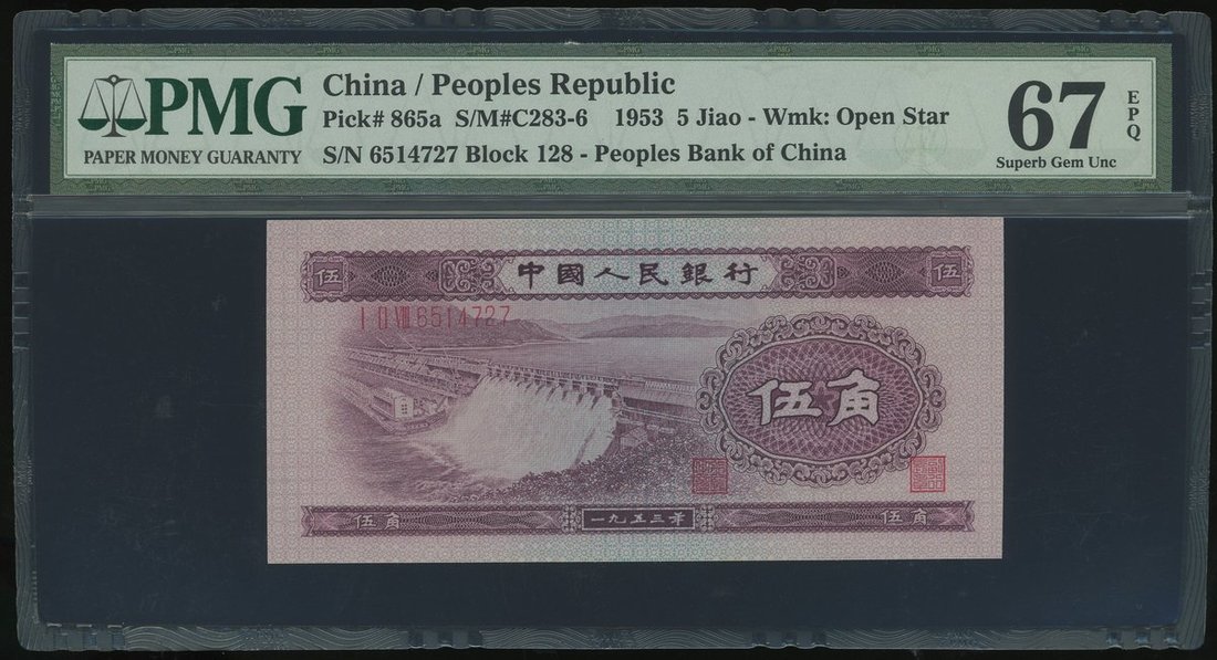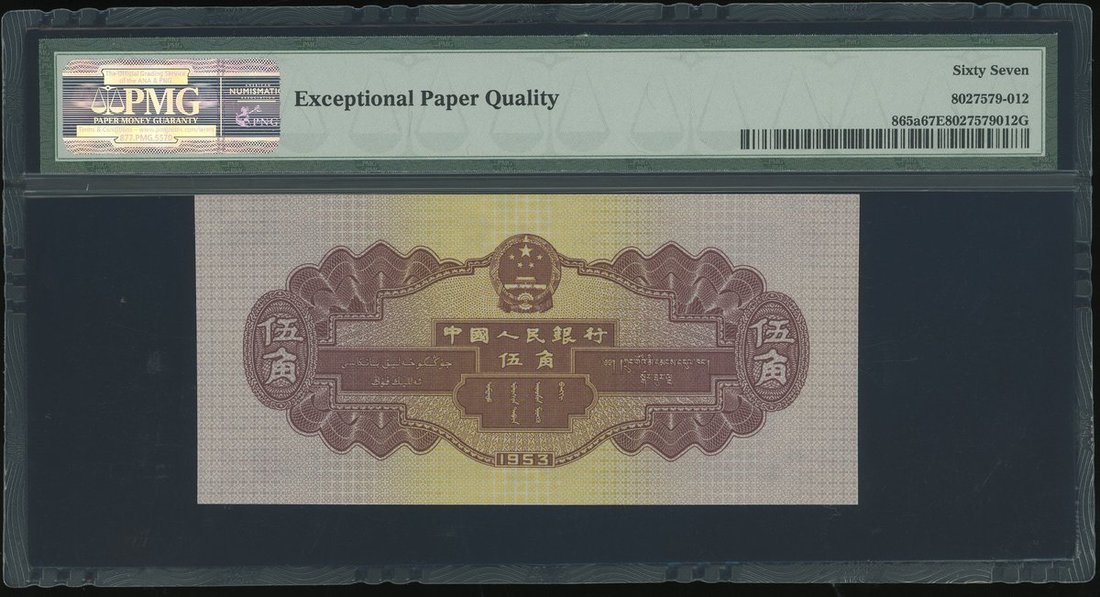 1953年中國人民銀行第二版人民幣5角,編號 I II VIII 6514727,PMG 67EPQ