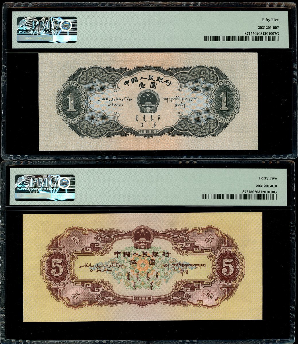 1956年中國人民銀行第二版人民幣1元2枚,編號VIII II X 2571482 及 IX IV I 7232478,分別PMG 55及45