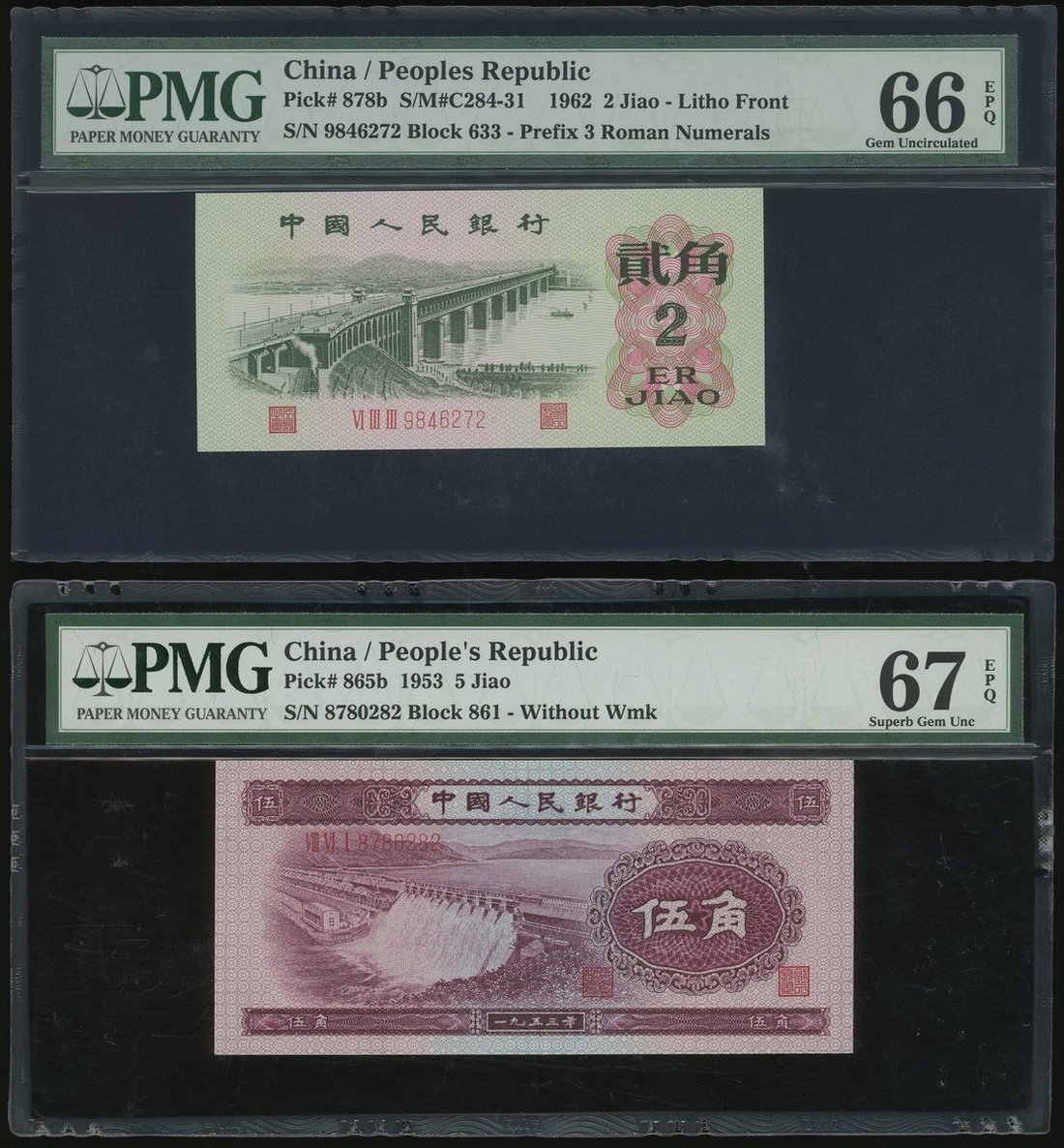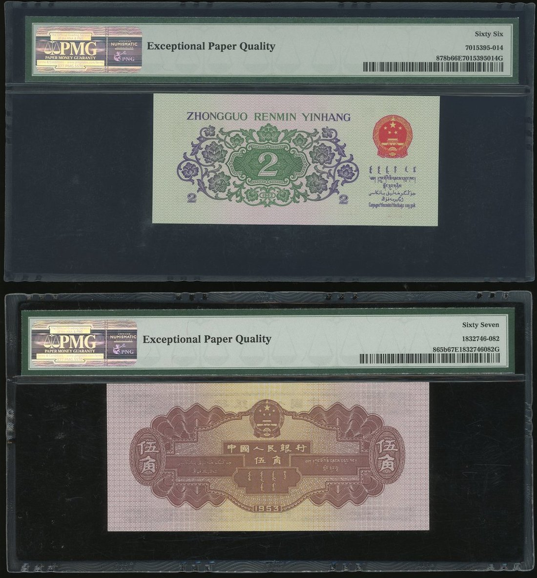 中國人民銀行1953年第二版及1962年第三版人民幣2角,及1953年5角,編號VI III III 9846272及 VIII VI I 8780282,分別PMG 66EPQ及67EPQ