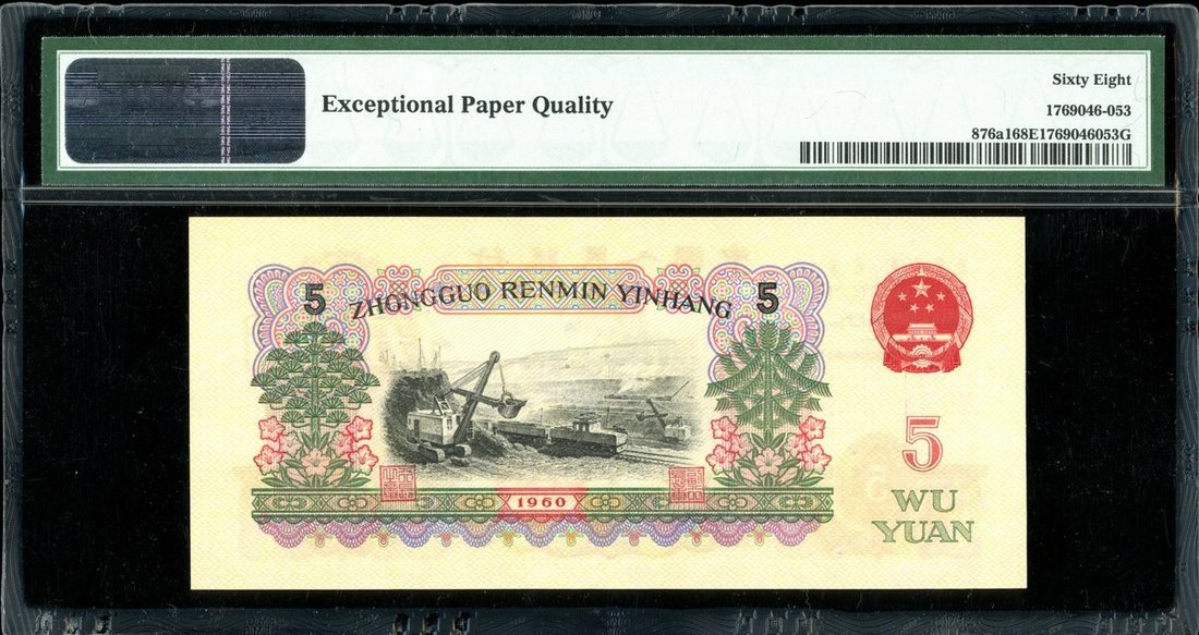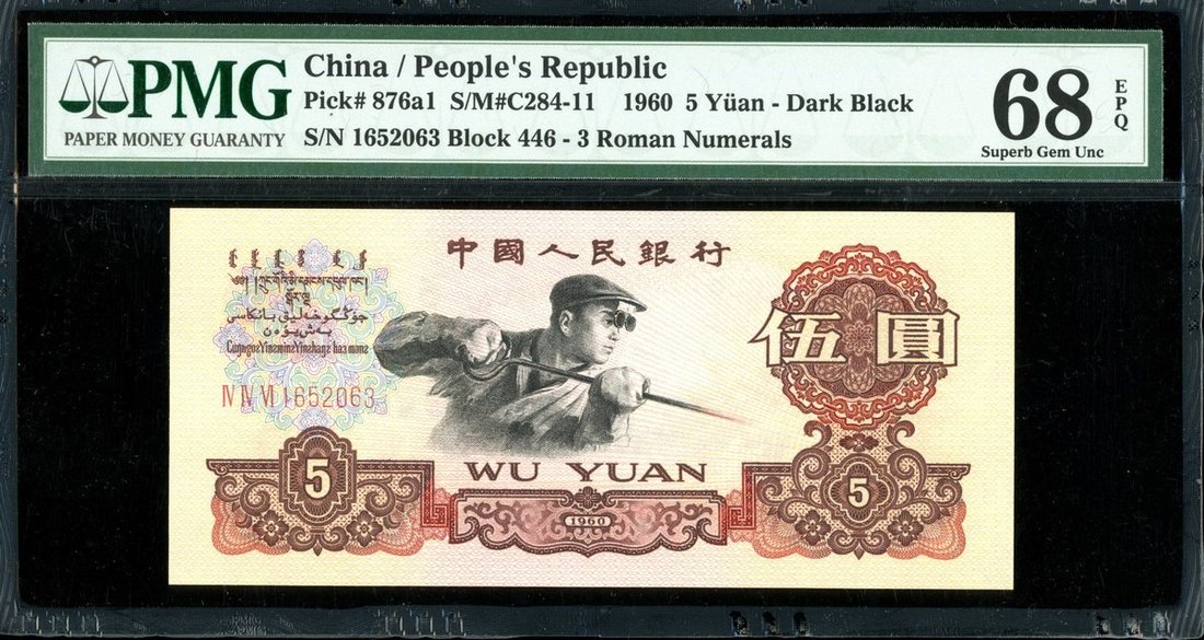 1960年中國人民銀行第三版人民幣碳黑版5元,編號IV IV VI 652063,PMG 68EPQ