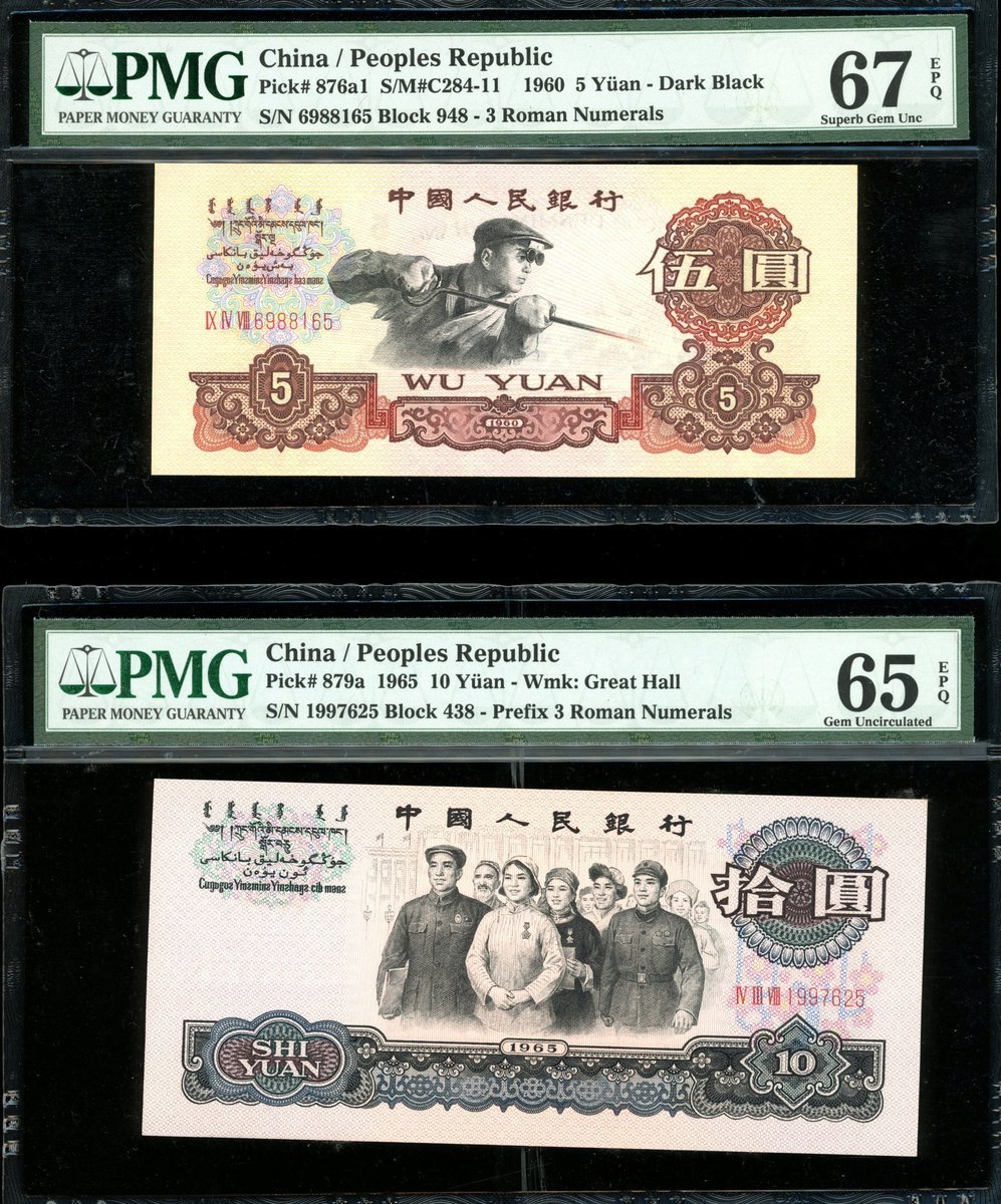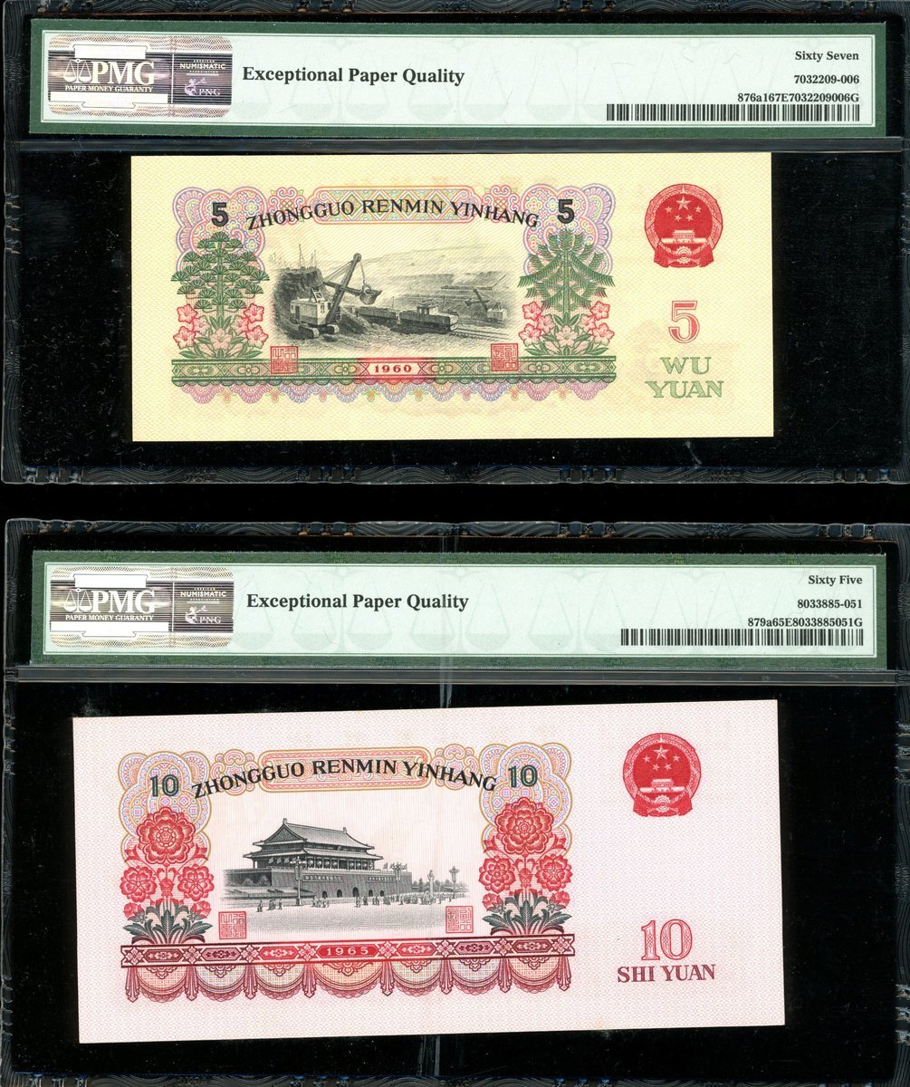 1960年中國人民銀行第三版人民幣碳黑版5元及10元,編號IX IV VIII 6988165及IV III VIII 1997625,PMG 67EPQ及65EPQ