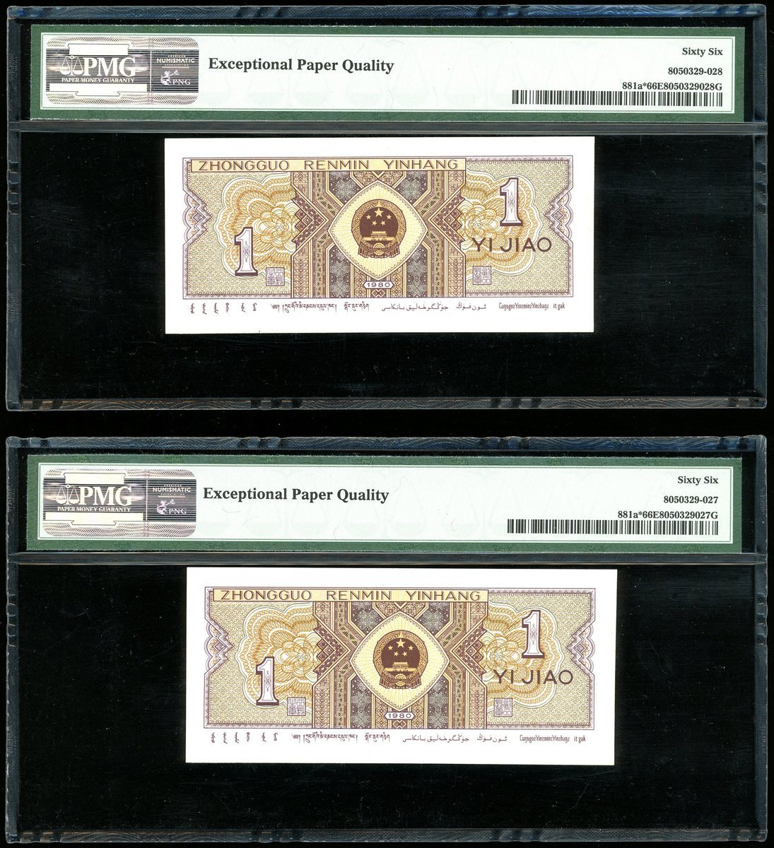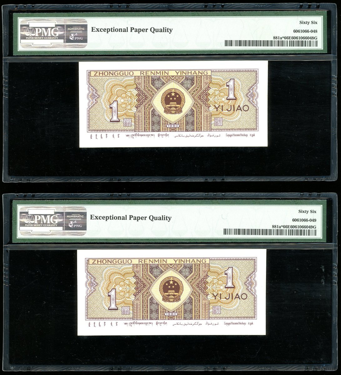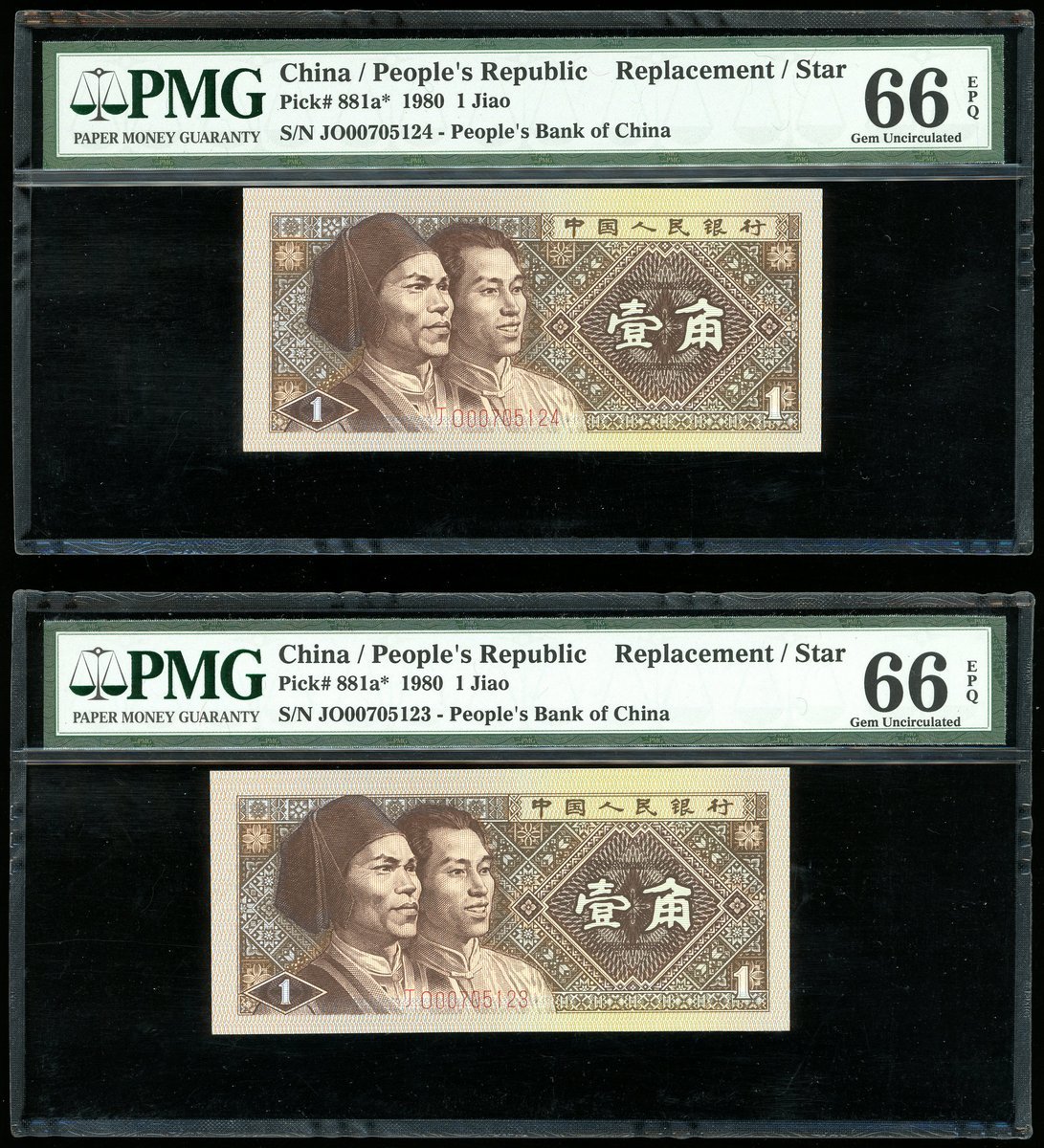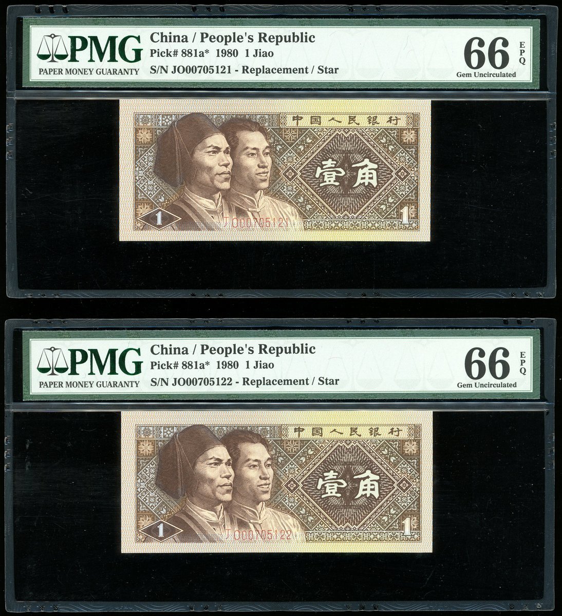 1980年中國人民銀行第四版人民幣1角連號4枚,補版編號JO00705121-124,均PMG 66EPQ