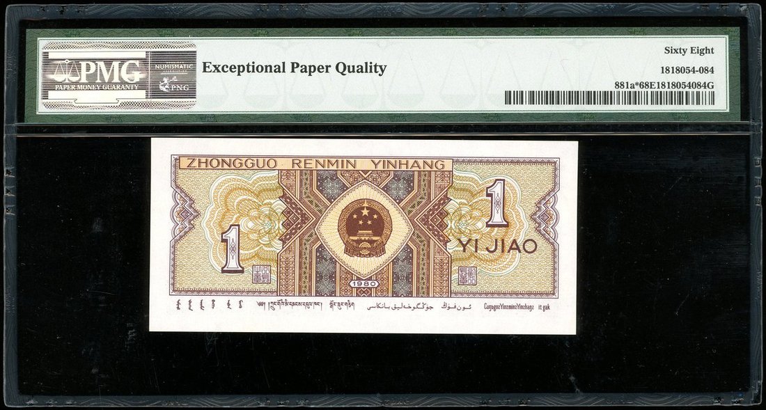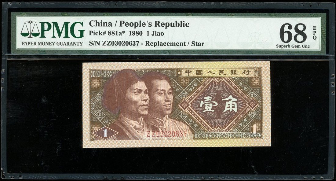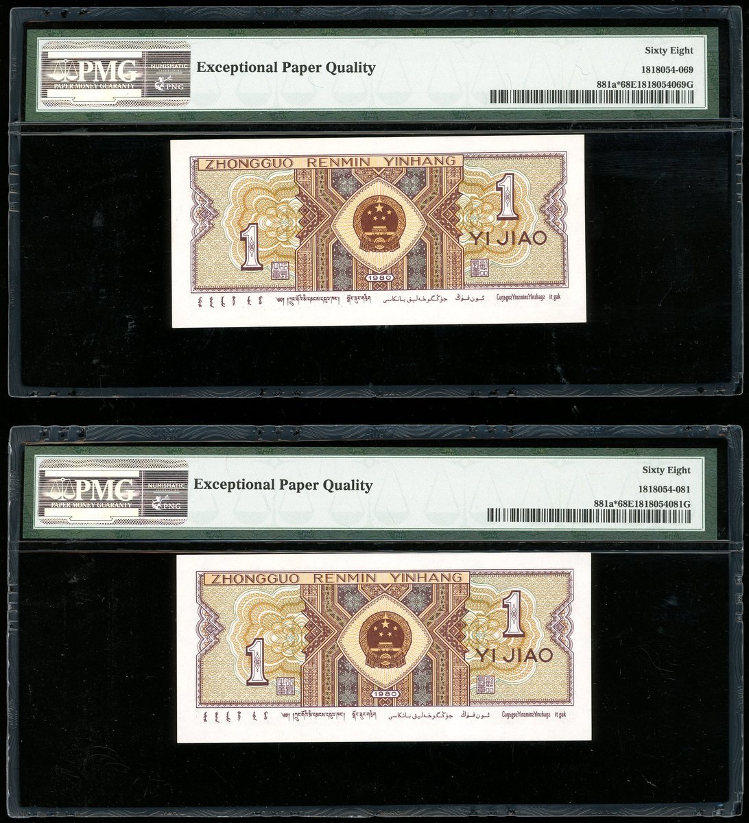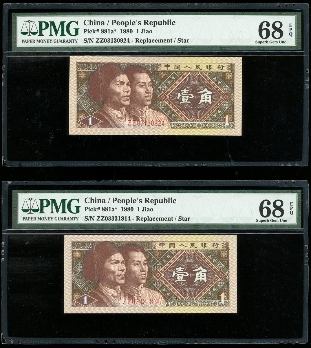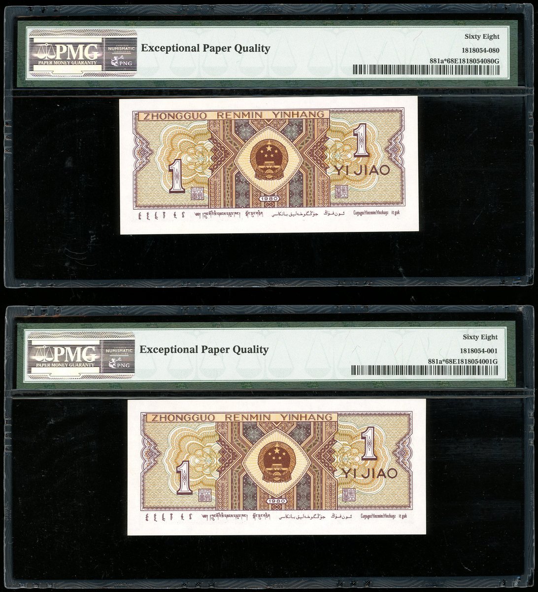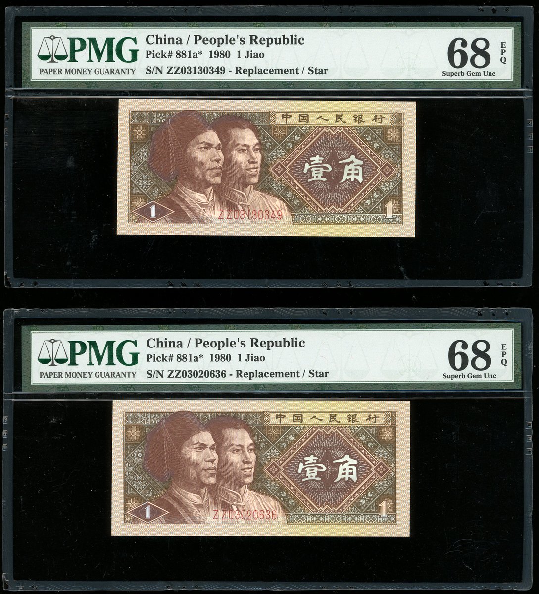 1980年中國人民銀行第四版人民幣1角一組5枚,補版編號JZZ03130924, ZZ03331814, ZZ03130349, ZZ03020636 及 ZZ03020637,均PMG 68EPQ