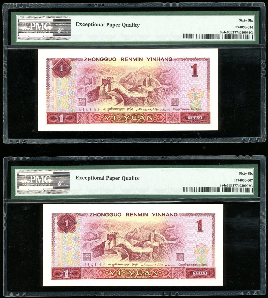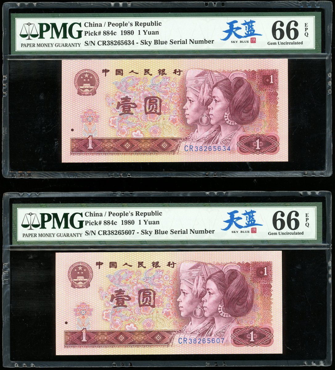 1980年中國人民銀行第四版人民幣1元一對,天藍編號 CR38265607及 634,均PMG 66EPQ