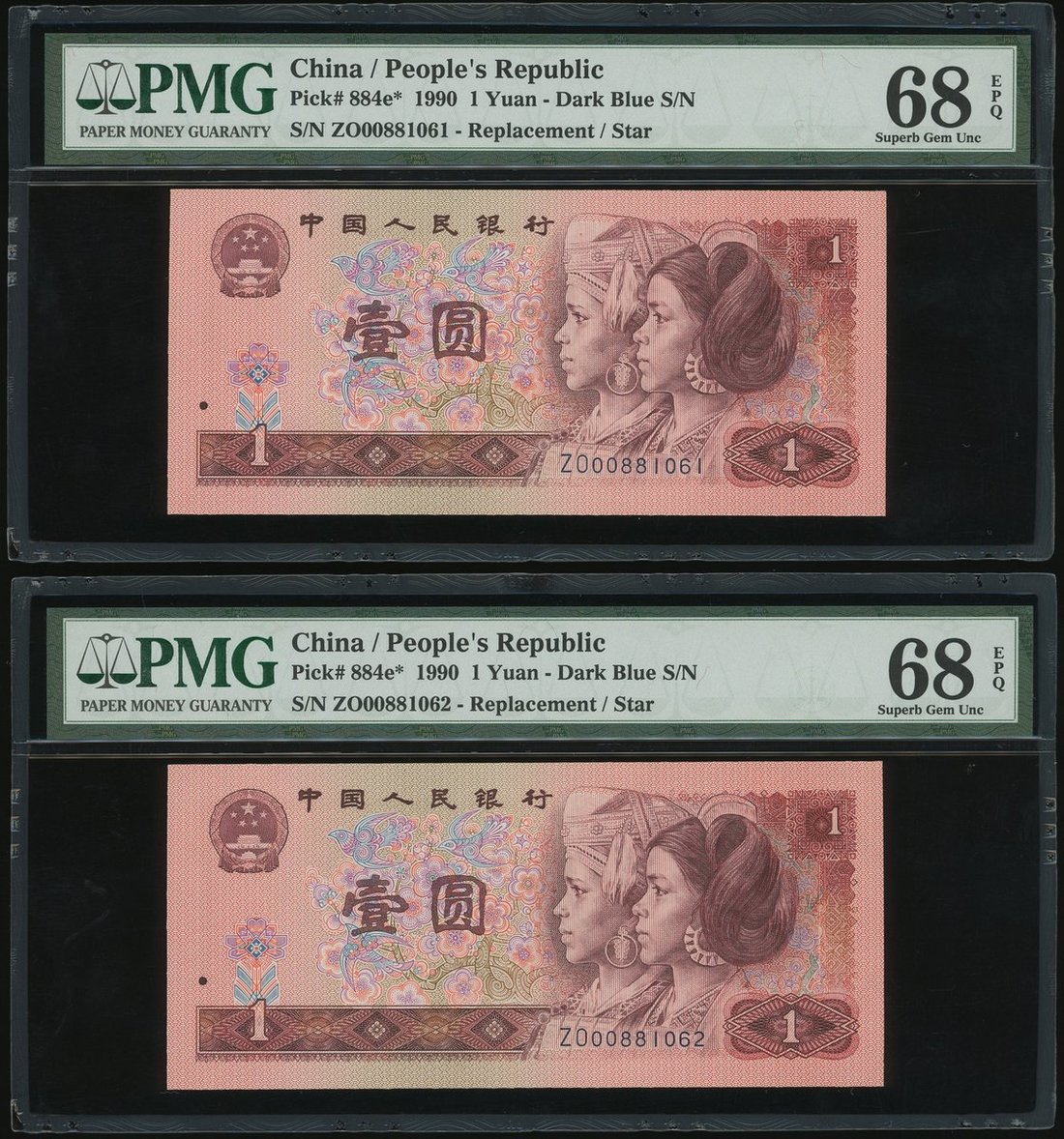 1990年中國人民銀行第四版人民幣1元連號2枚,深藍補版編號ZO00881061 及 062,均PMG 68EPQ