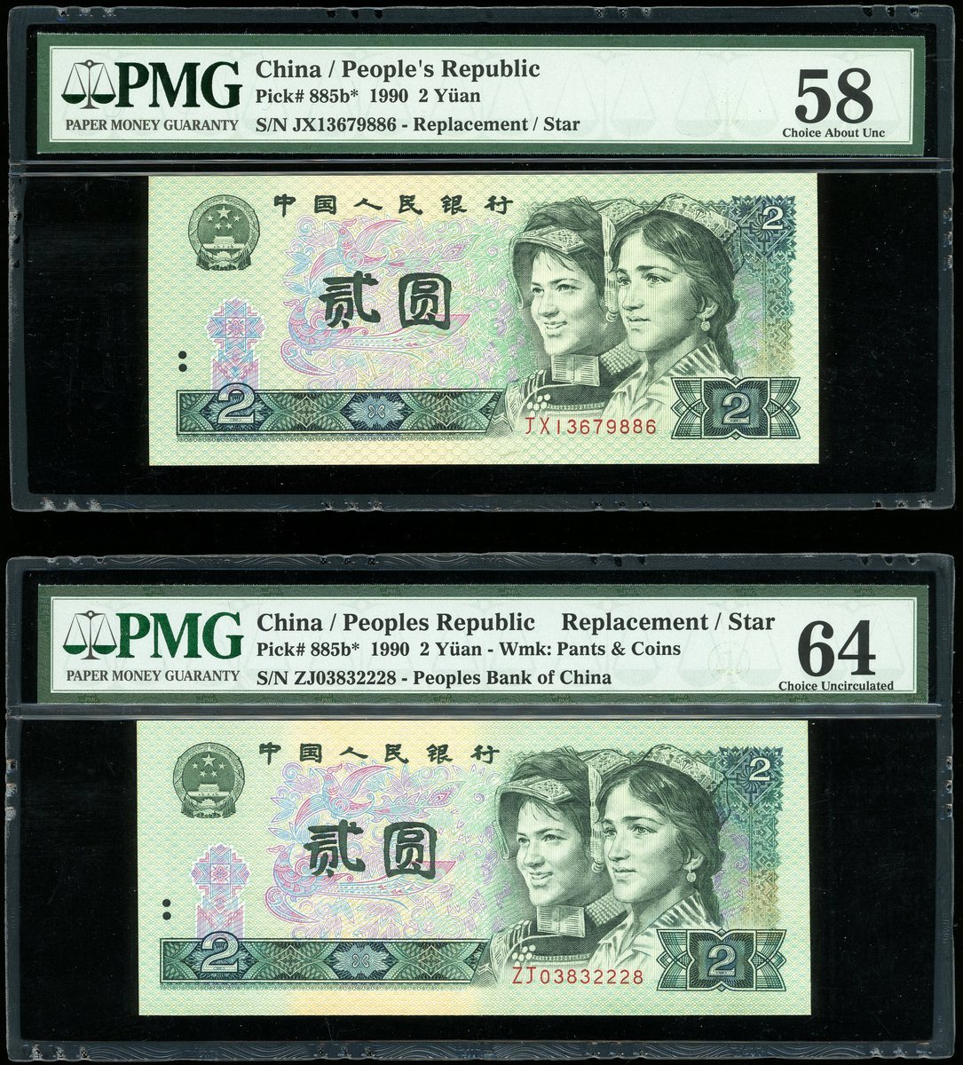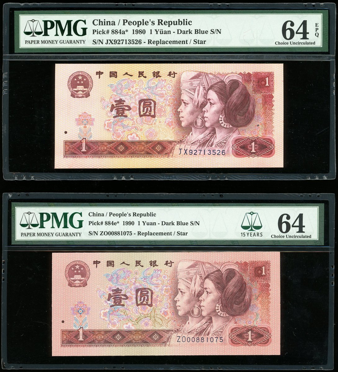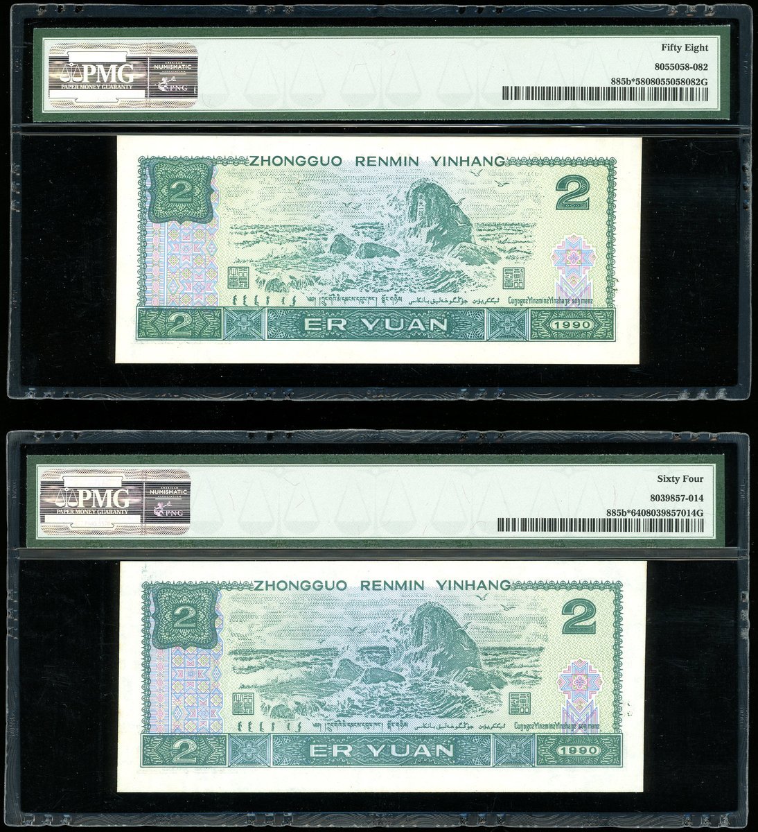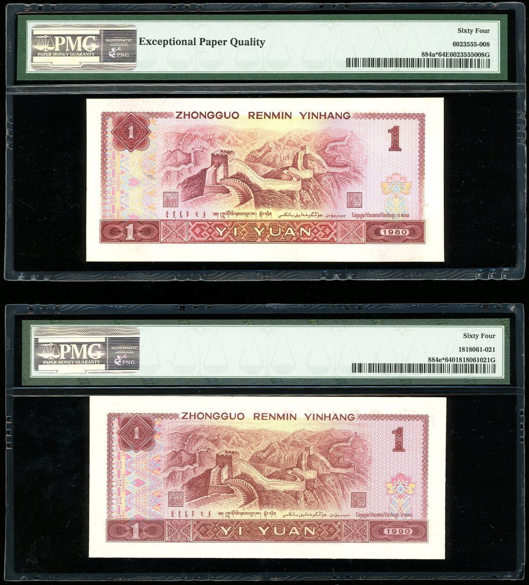 1980-90年中國人民銀行第四版人民幣1元2枚,深藍補版編號JX92713526 及 ZO00881075,及2元2枚,補版編號JX13679886 及 ZJ03832228,分別PMG 64EPQ, 64, 58 及 64